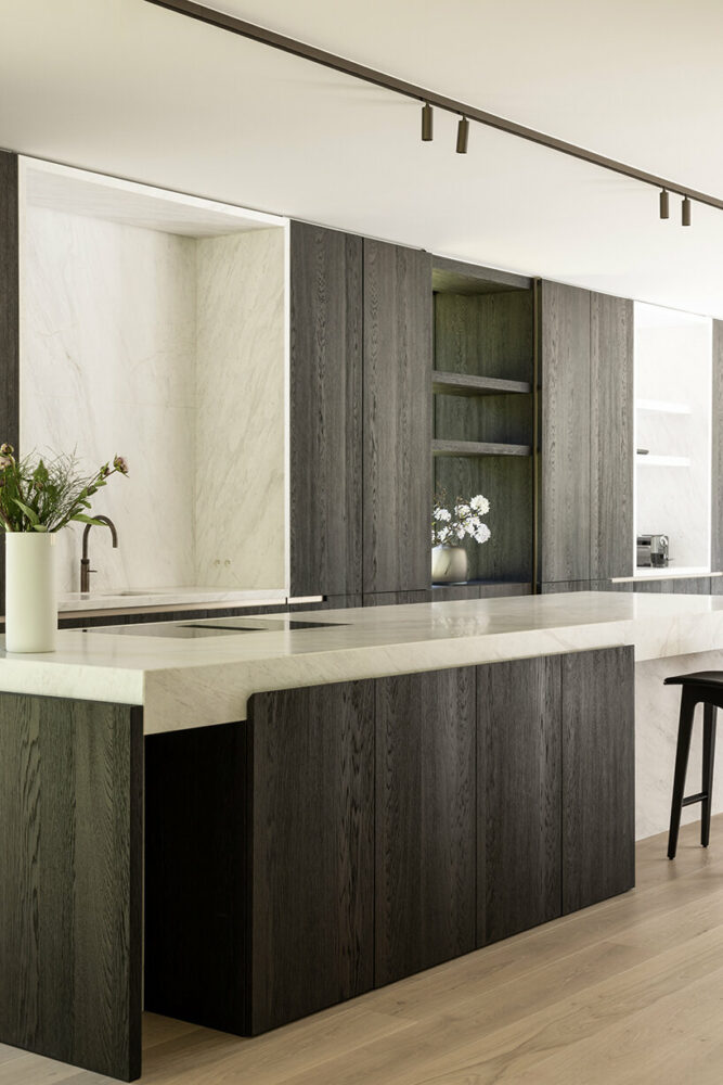 Mieke Van Herck architects (see more here) complemented the renovation of Residence EB with a pavilion that accommodates the kitchen on a floating platform. The modern design of the architectural extension blends perfectly with the rural architecture thanks to the facade cladding boasting black afrormosia planking. Furthermore, the new volume at the rear of the house flows into a covered terrace with a built-in barbecue. In line with Mieke Van Herck architects’ signature, the view of the outdoor environment is omnipresent and always nearby. An inventive detail that nicely illustrates this synergy is one of the windows in the kitchen. That window extends from ceiling to floor and is flanked inside by a bespoke cupboard with incisions, allowing daylight and greenery to reach the sheltered interior subtly.
