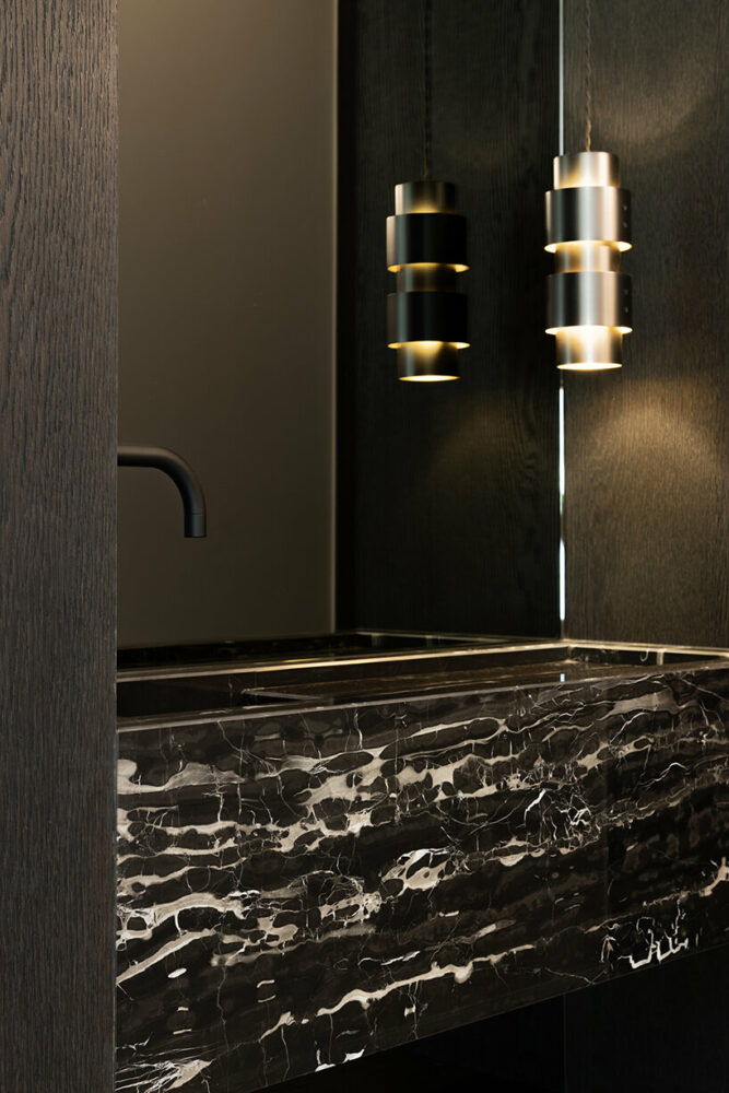 In a quiet neighborhood of ‘s-Gravenwezel in Belgium, local practice Mieke Van Herck architects renovated an existing thatched-roof country house in a continuous effort to seek harmony between modern and rural architecture. Dubbed Residence EB, the abstracted rural dwelling features a remarkably sleek black pavilion that offers space for the kitchen on a floating platform. The ground floor living spaces were also maximized and finished with natural materials such as marble and Pietra dei Medici natural stone and refined veneers. Two other notable features are the reception area with ultra-large sitting space and the sober workspace framed in a bay window, reminding current owners of the original Belgian mansion.