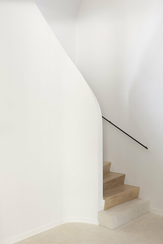Moving to the entrance hall of Residence EB, the practice reimagined it with a modern-countryside upgrade, bringing ‘Schwung’ to the home with its smooth curves. Upstairs, the main bedroom reads like a hotel suite, and the family’s daughter was given a separate leisure area where friends always feel welcome. ‘She also feels at home in this dream home that her parents purchased as a coup de foudre, and which after the renovation feels even more like a signature home for life and much longer,’ shares the team at Mieke Van Herck architects .