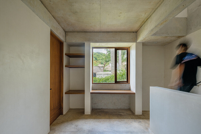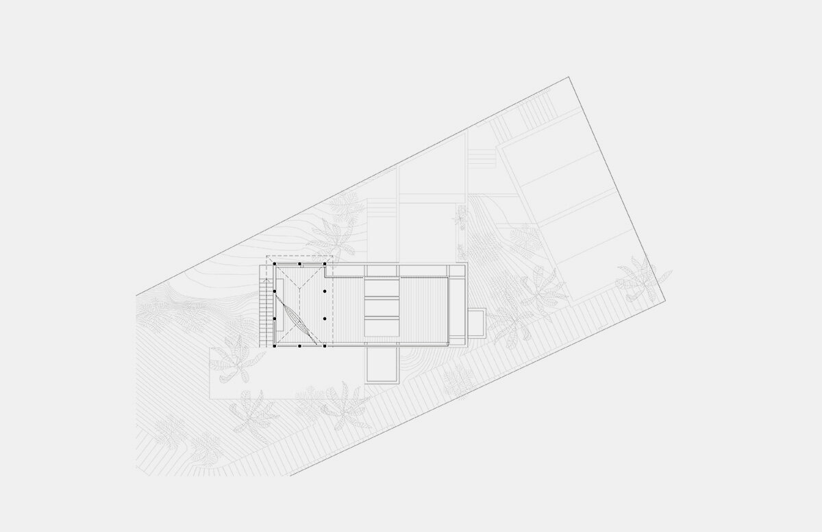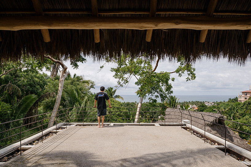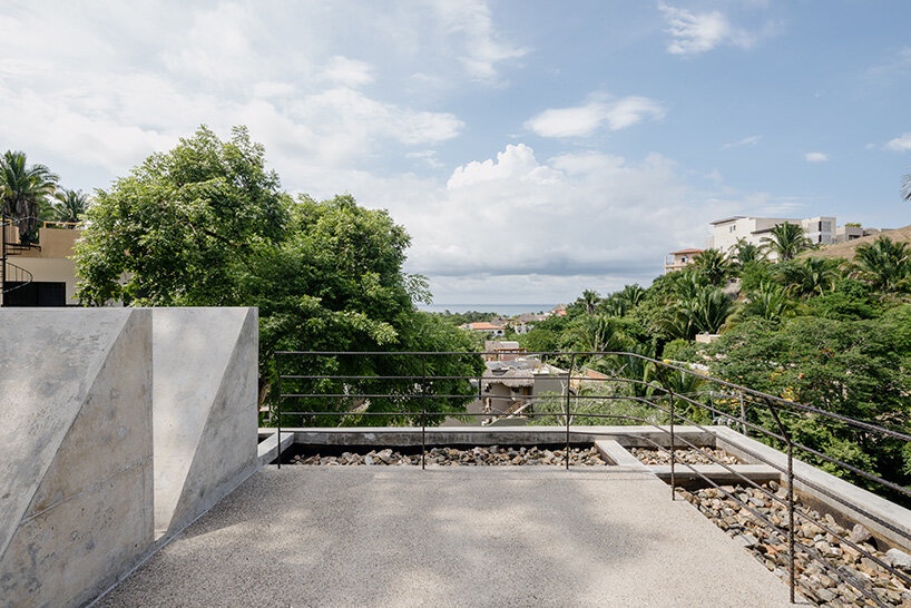 the project sits like a ring placed over the terrain, with its funnel-like roof forming a shaded perimeter walkway and an introverted core.