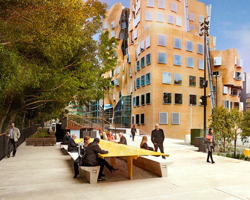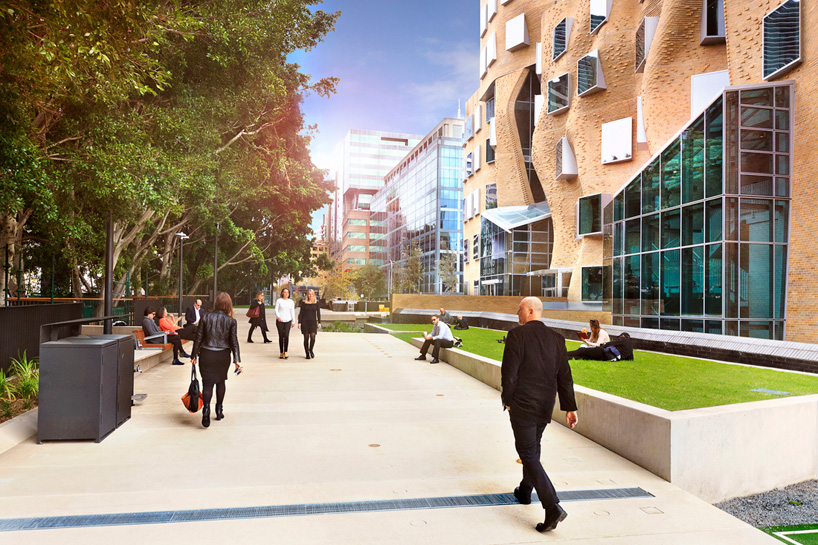 the green corridor, which occupies a former freight rail route, features a series of integrated platforms that can be used for a variety of recreational activities and events. the route takes pedestrians past some of sydney’s most eye-catching new landmarks, including frank gehry’s brick-clad university building.