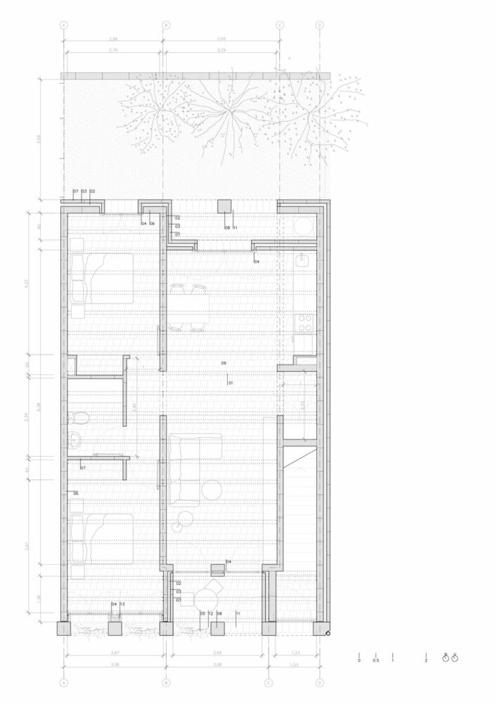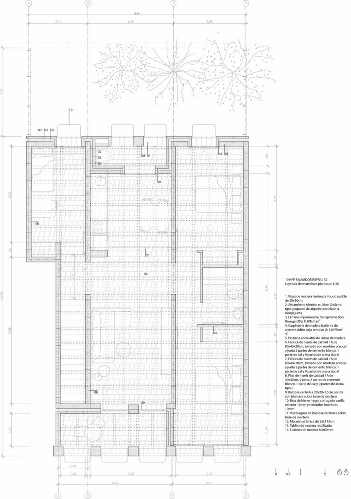 In contrast to the phase one building (39 Salvador Espriu) with an 8-meter buildable depth, this second phase presents a 13.5-meter depth, necessitating a design approach that frees the facade from structural load-bearing duties to optimize illumination for the units. Floors are constructed using wooden beams resting on parallel walls between the dwellings, composed of 20x20x80 cm local sandstone blocks. These marés pieces are halved to adhere to weight regulations for worker handling.