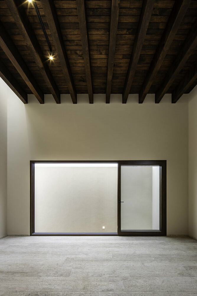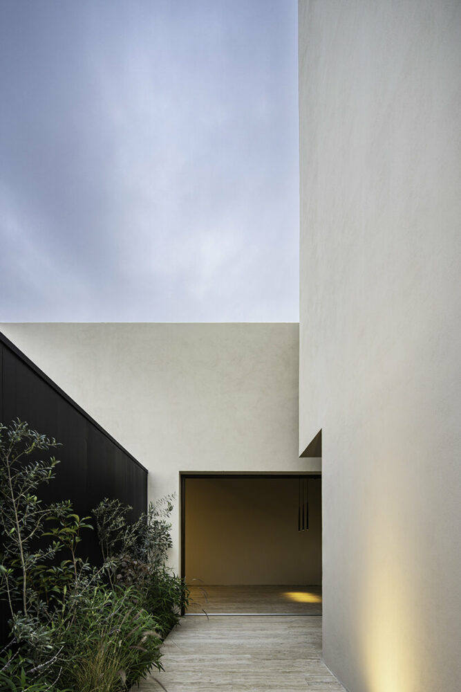 The arrangement of the volumes forms a central patio, creating visual openness throughout the residence. To maintain seamless walls, storage spaces and bathrooms are hidden behind walnut wainscoting. Toward the patio, the volumes appear as monolithic masses in cantilever, resting on sliding panels within the walls, which extend the view and strengthen the connection with the outdoors.