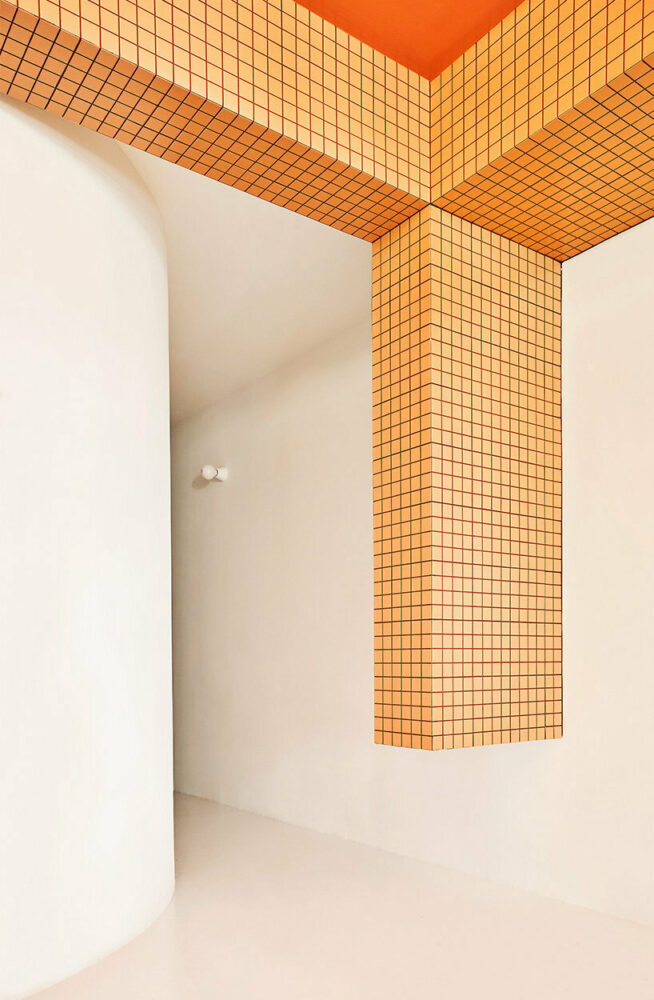 the project sits like a ring placed over the terrain, with its funnel-like roof forming a shaded perimeter walkway and an introverted core.