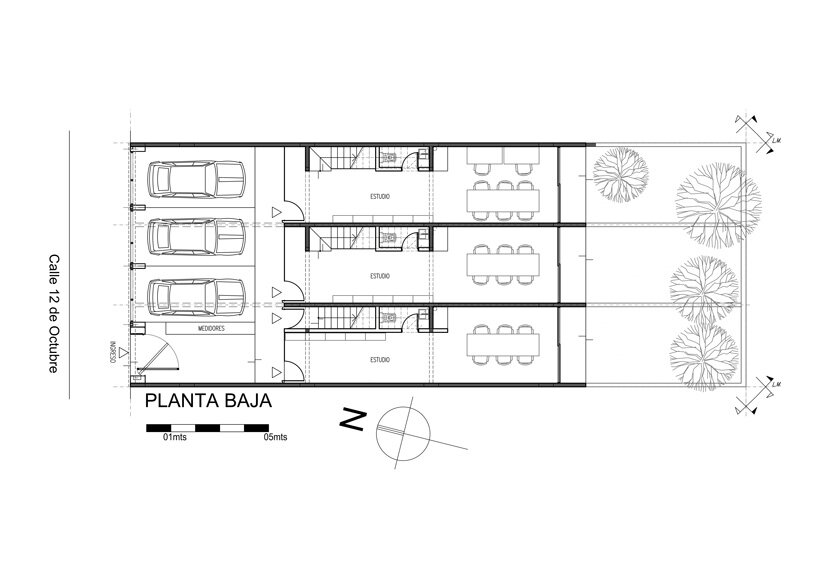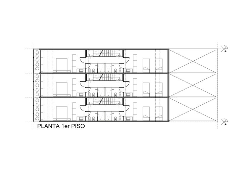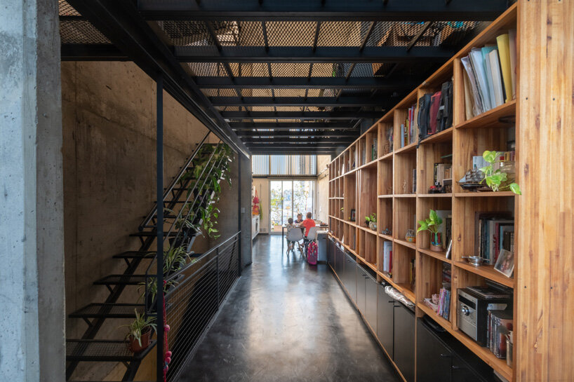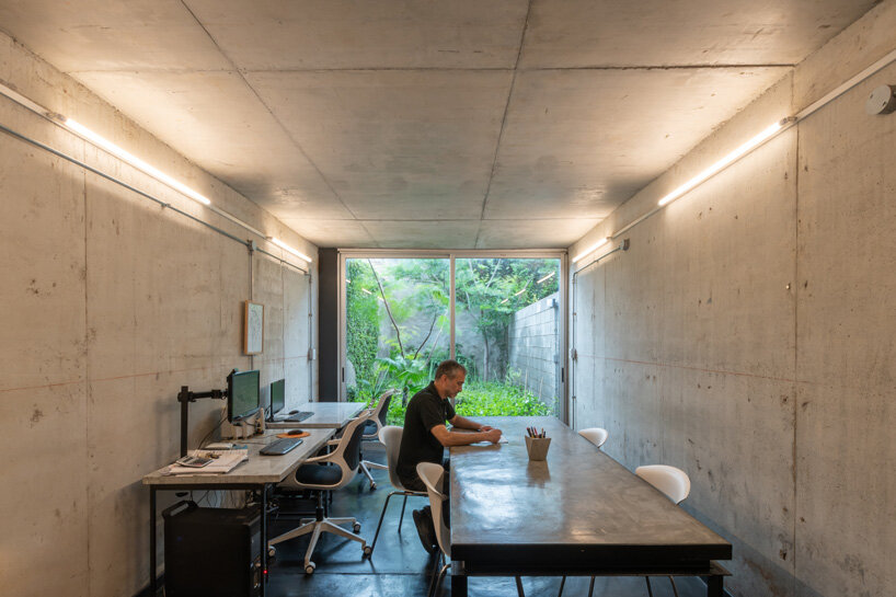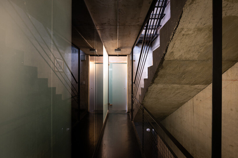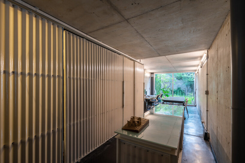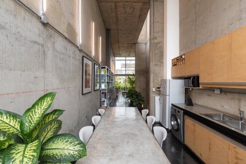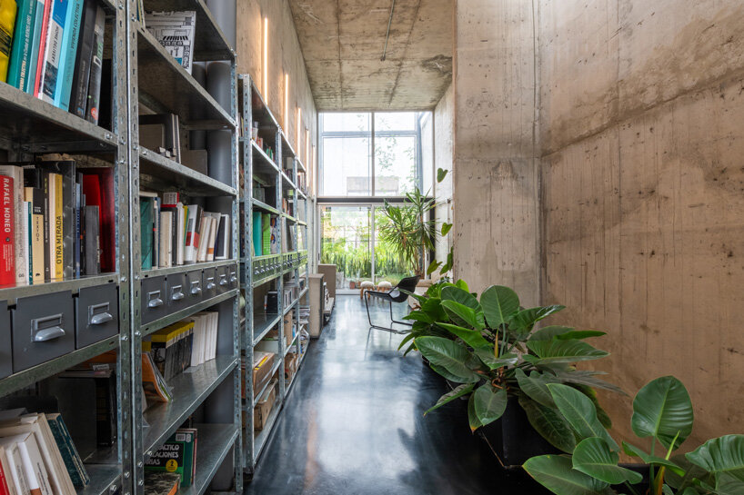 the project sits like a ring placed over the terrain, with its funnel-like roof forming a shaded perimeter walkway and an introverted core.