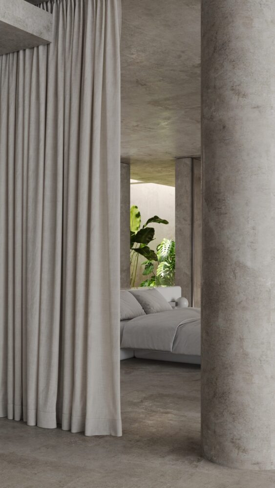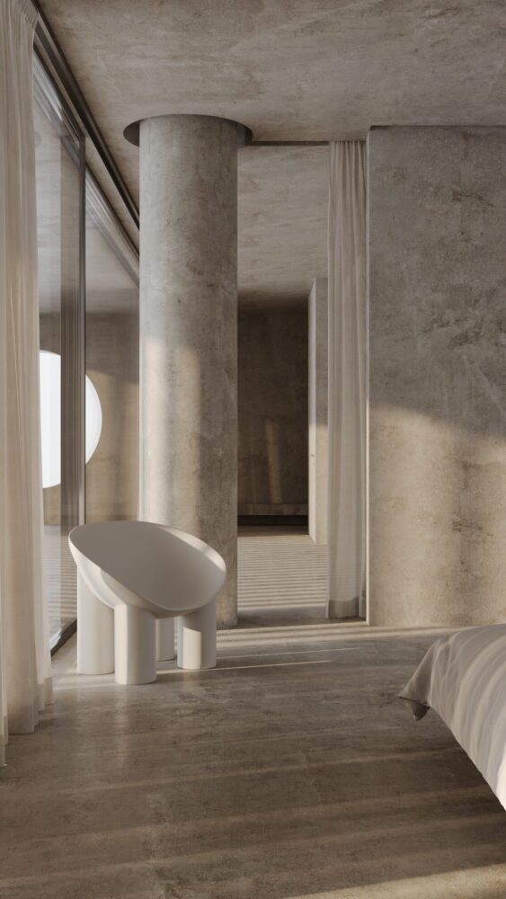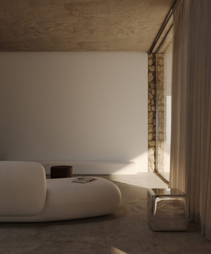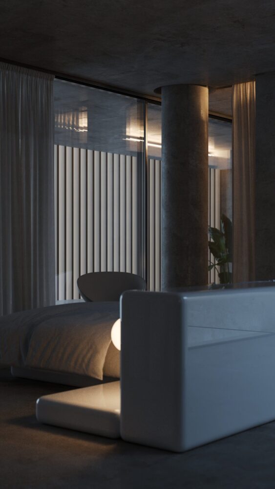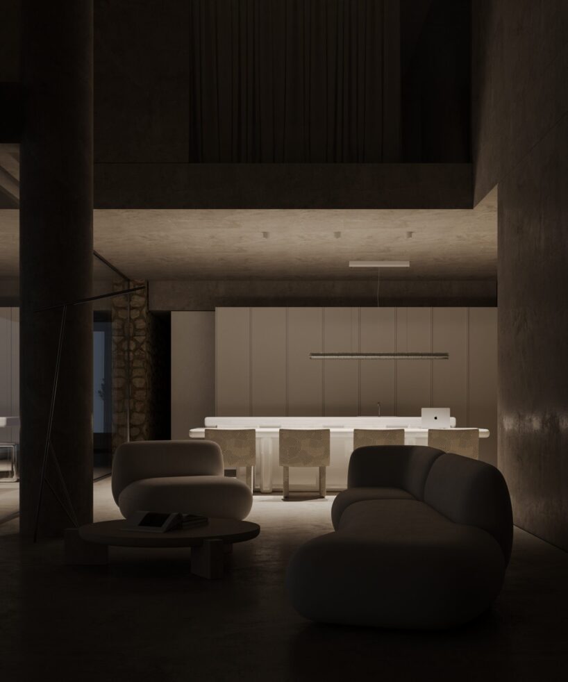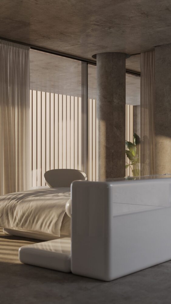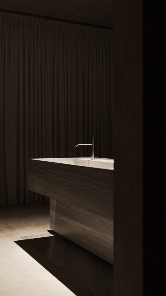 The architecture reflects SHOVK Studio’s restrained and minimalist approach. The material palette incorporates local stone, concrete, warm wood, and large glass openings that reduce the visual divide between the interior and the outdoor environment. Inside, the spatial composition balances natural textures with a controlled, neutral finish. Grey marble surfaces, glossy white elements, soft textiles, and integrated greenery contribute to a bright yet subdued atmosphere.