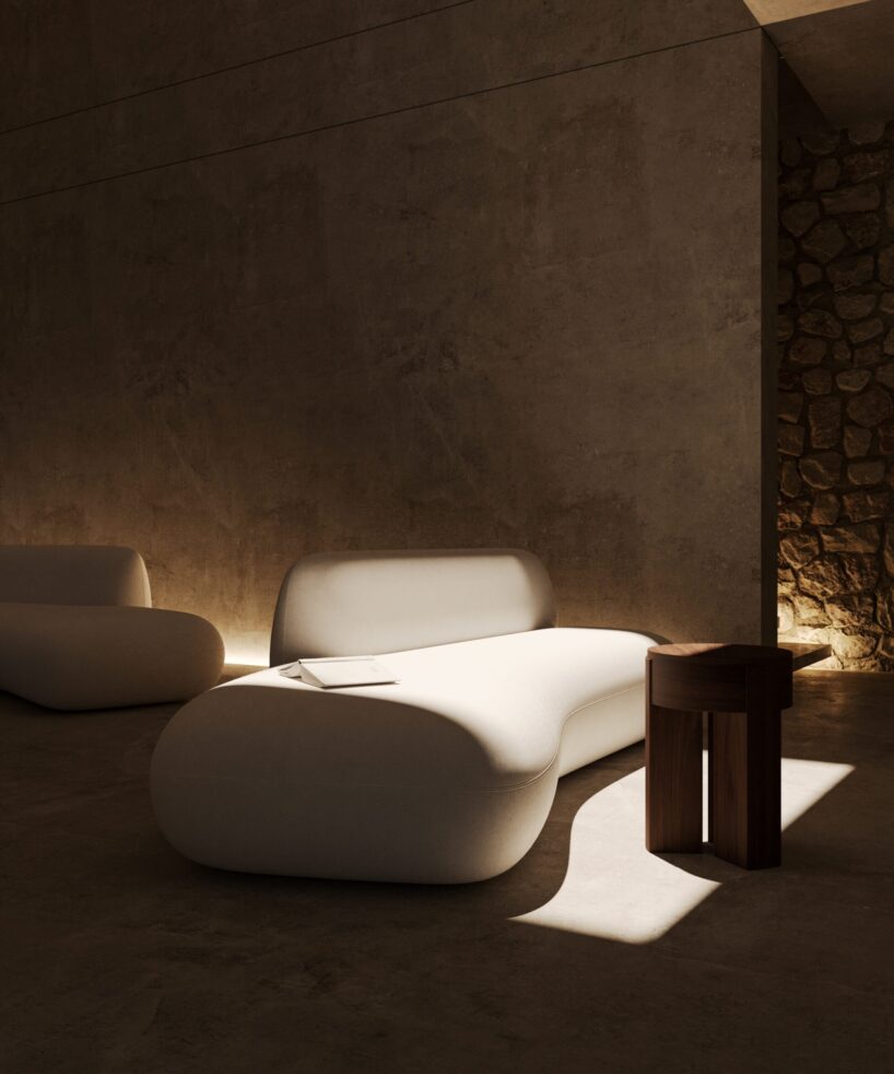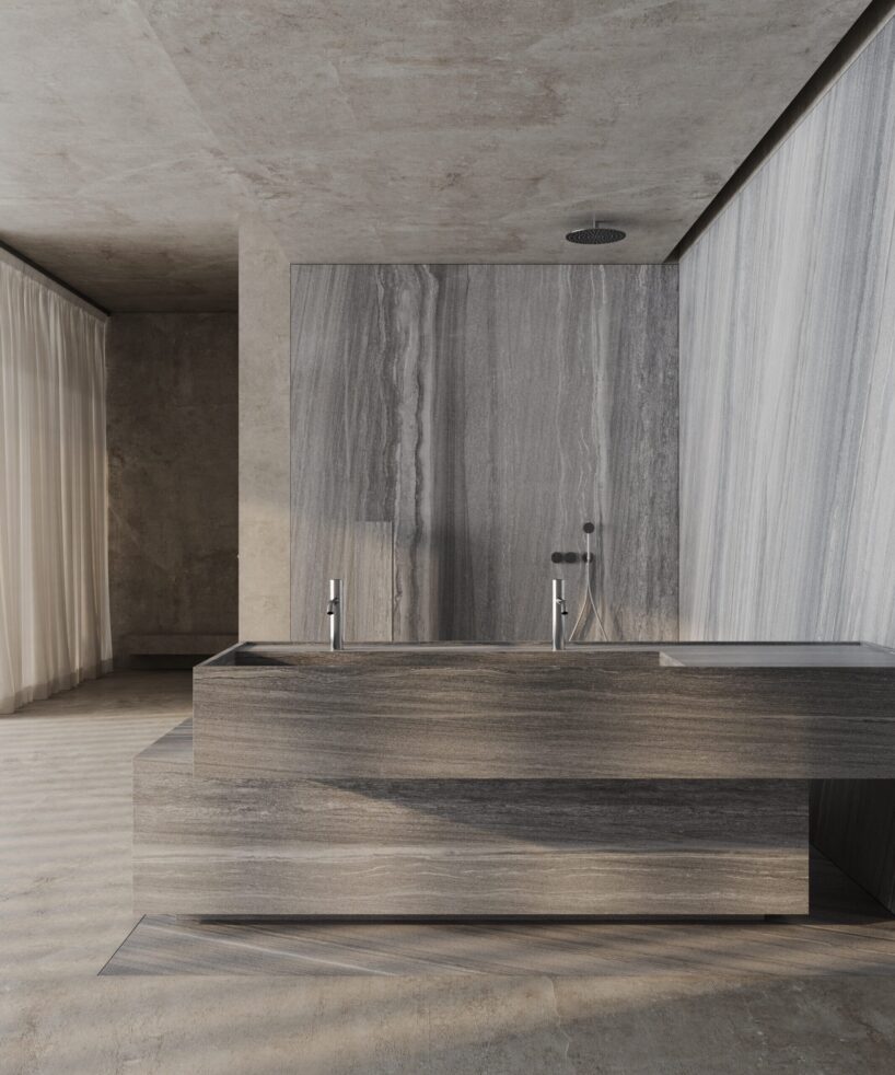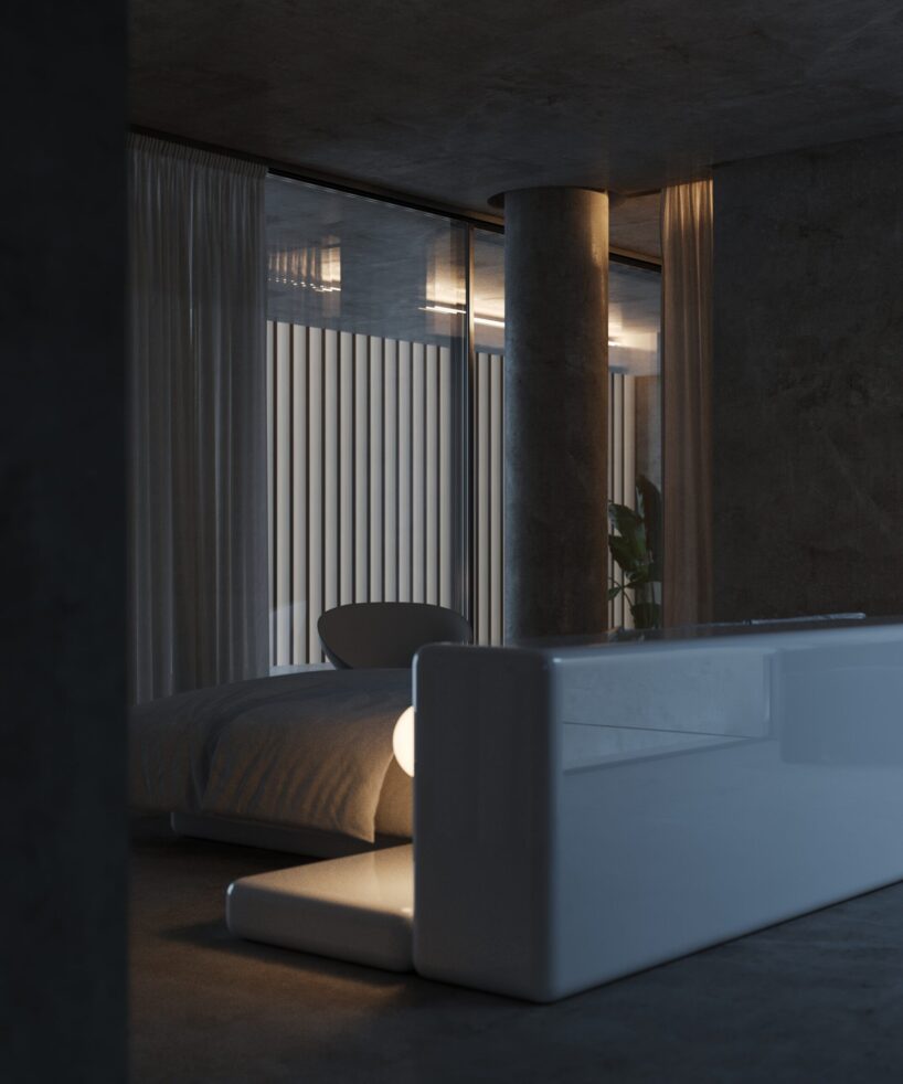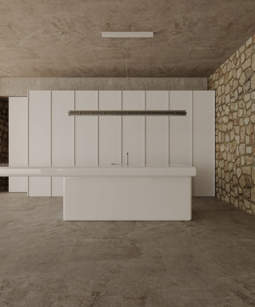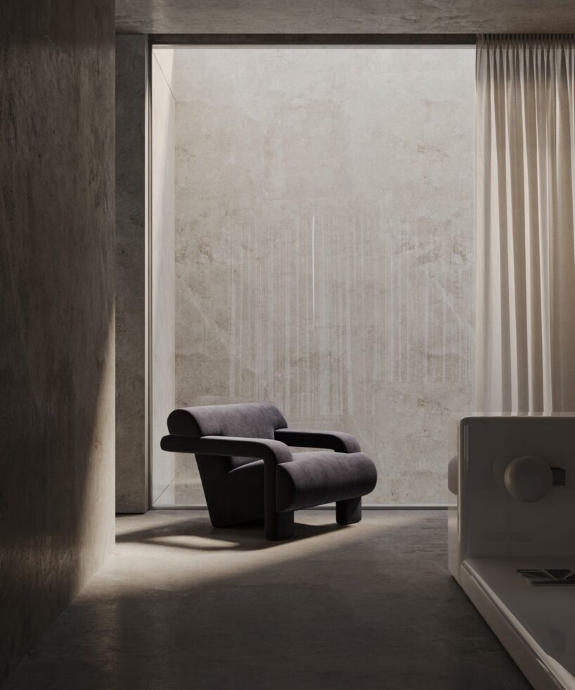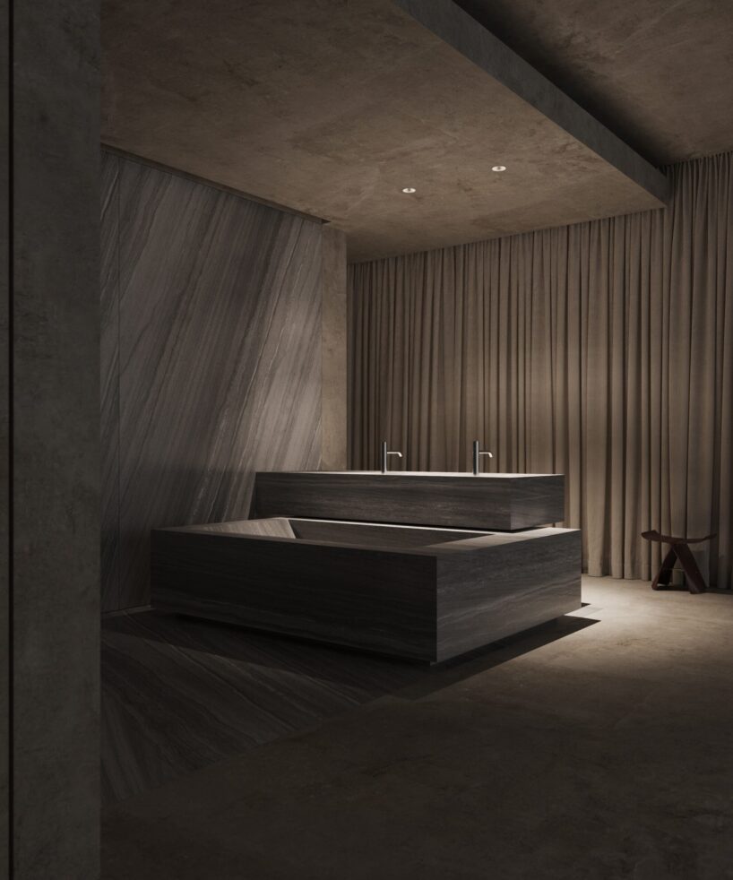 The architecture reflects SHOVK Studio’s restrained and minimalist approach. The material palette incorporates local stone, concrete, warm wood, and large glass openings that reduce the visual divide between the interior and the outdoor environment. Inside, the spatial composition balances natural textures with a controlled, neutral finish. Grey marble surfaces, glossy white elements, soft textiles, and integrated greenery contribute to a bright yet subdued atmosphere.