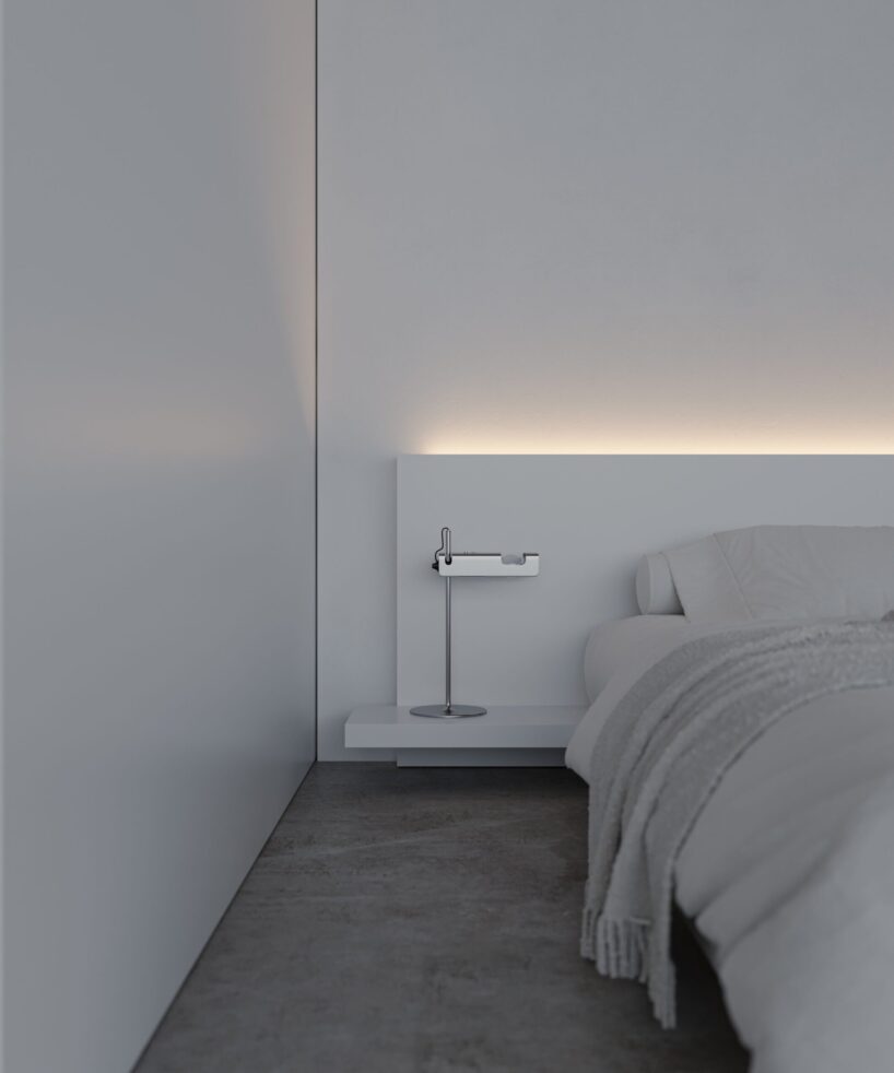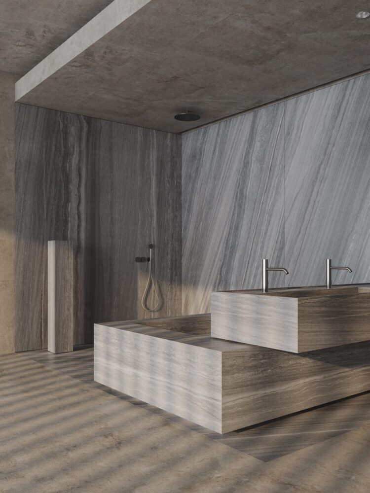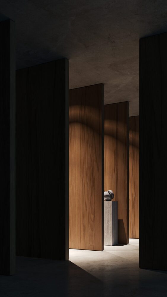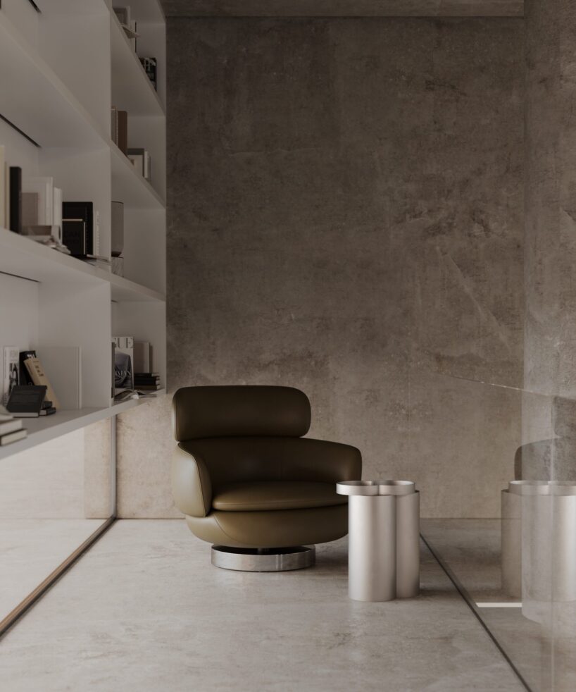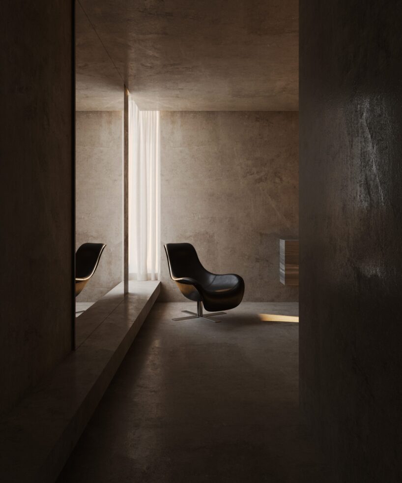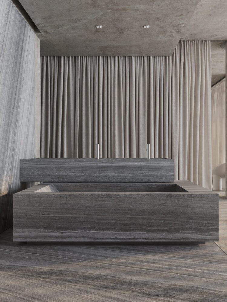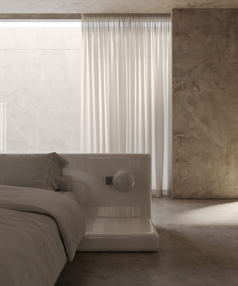 The architecture reflects SHOVK Studio’s restrained and minimalist approach. The material palette incorporates local stone, concrete, warm wood, and large glass openings that reduce the visual divide between the interior and the outdoor environment. Inside, the spatial composition balances natural textures with a controlled, neutral finish. Grey marble surfaces, glossy white elements, soft textiles, and integrated greenery contribute to a bright yet subdued atmosphere.