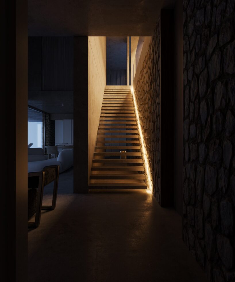 Double-height volumes and carefully positioned light portals increase openness and reinforce the project’s emphasis on spatial clarity. Ambient lighting further supports comfort and visual continuity throughout the home. The program,  developed by SHOVK Studio, includes four rooms, a spacious common area, a library, and an open terrace oriented toward the mountains and the ocean. Across both structure and interior, the design responds to the site’s physical characteristics and visual identity, establishing a residence grounded in its coastal setting.