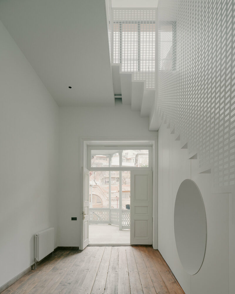 the project sits like a ring placed over the terrain, with its funnel-like roof forming a shaded perimeter walkway and an introverted core.