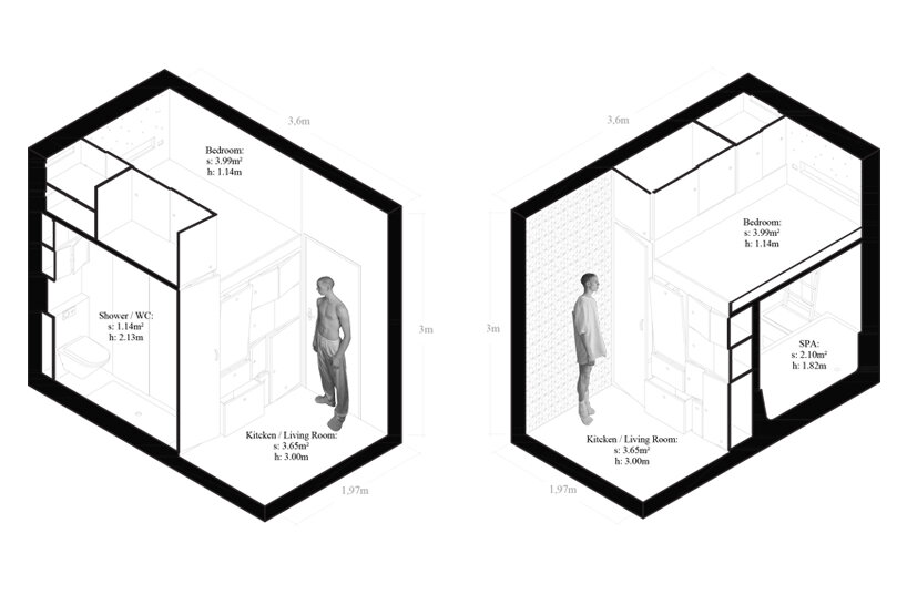 The autonomous apartment comprises a small bed, a bench along the window, a small kitchen, a rain-shower, two infrared saunas, and a whirlpool bath. In its design it becomes a temple in the proportions of its owners. Beatriz Ramo and Bernd Upmeyer’s heights are 1.72 meters and 1.78 meters respectively, and the rooms are dimensioned according to the height and width that they need to perform their functions. The home seemed to get bigger the more programs were added to it, made possible by the adaptation of heights. Further, the Dutch designers of STAR strategies + architecture (see more here) and BOARD – Bureau of Architecture, Research, and Design (see more here) have shaped the four distinct spaces based on standard products for affordability: the bedroom was designed with a specific mattress in mind; the spa according to the bathtub length; the kitchen based on the mini-fridge depth.