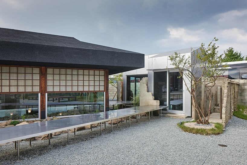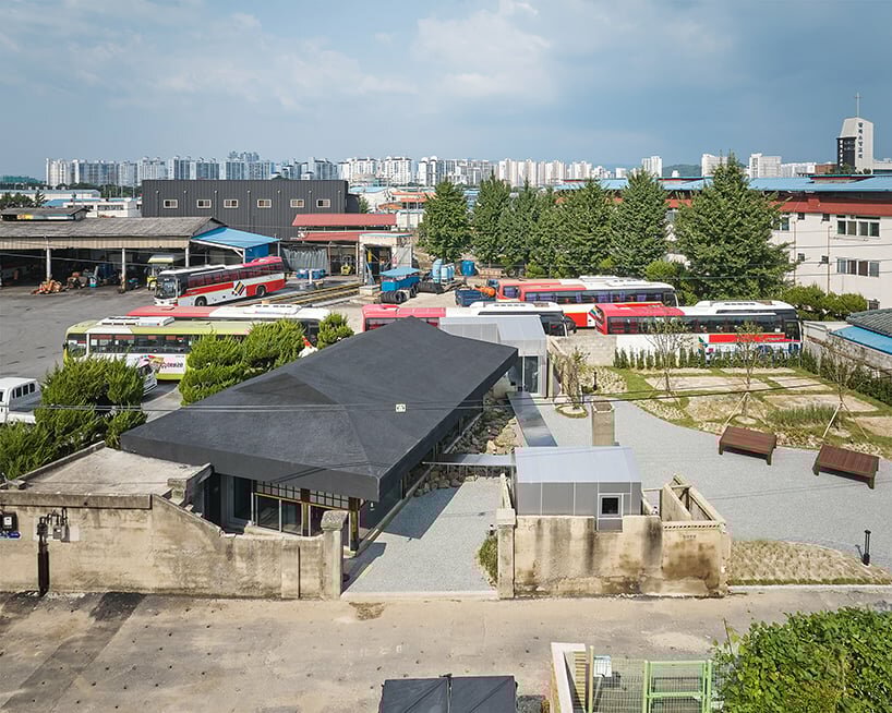 the project sits like a ring placed over the terrain, with its funnel-like roof forming a shaded perimeter walkway and an introverted core.