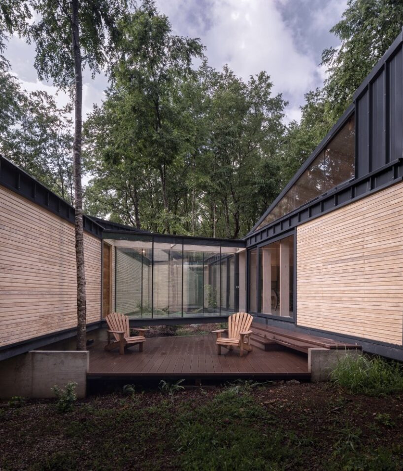 chile-based architectural studio triangular has completed its ‘forest house‘ in the middle of a patagonia woodland area. the final composition takes shape as two main masses topped by slanted roofs, while two glazed bridges unite them, and let inhabitants float across the forest. the way the house is divided allows the existing trees to cross it — enclosing a small garden — as well as allows plenty of daylight to tackle in.