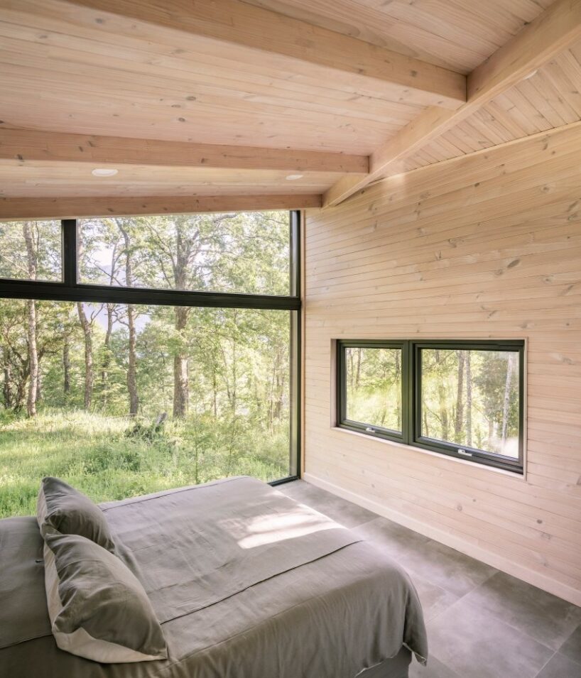 when it comes to materiality, the design team opted for a metallic cladding with the allegory of a burned log, where the bark protects its body. depicting this concept to the house, the corrugated envelope protects the acetylated wood of the intermediate facades and the pine of the interior walls.