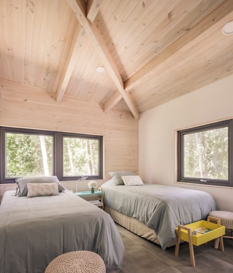 located in the middle of a ‘hualles’ and ‘ulmos’ forest with the colico lake in the background, the project starts from a rectangle oriented to the northeast, which breaks and separates to protect the existing trees. as the architects mentioned, the arrangement of the house obeys two concepts. first, ‘family vacations’ that entails both large meeting spaces and places with total independence. and the second follows the adaptability of uses. taking into account the fluctuation of users, four areas are defined: for the whole family, a parents area, a children’s space, and one for guests.