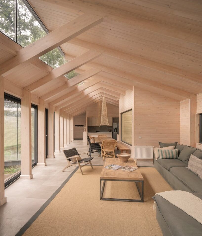 as mentioned above, the entire dwelling sits on a concrete base that absorbs the slope of the land. on this plinth, there are a series of prefabricated wooden panels and frames that configure the structure and geometry of the house. this prefabrication helped to reduce the time of construction despite the complexity involved. meanwhile, the irregular frames that make up the main volume and the breaks in the roofs provide views of the foliage of the trees from the inside. at the same time, natural light enters all areas of the house.