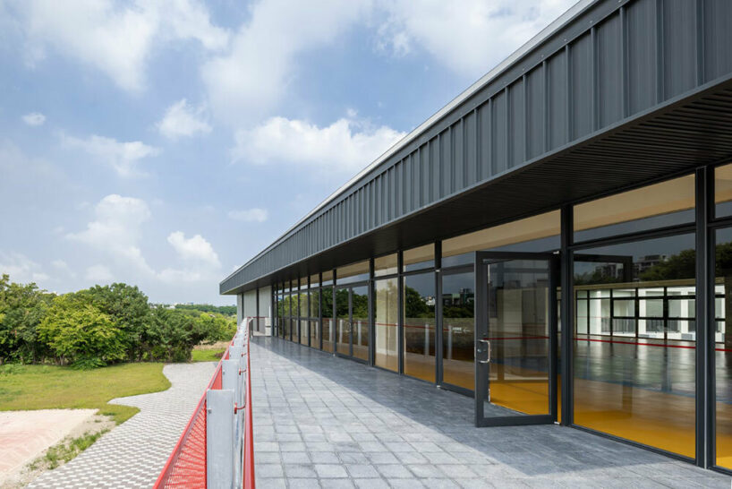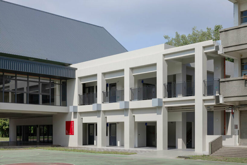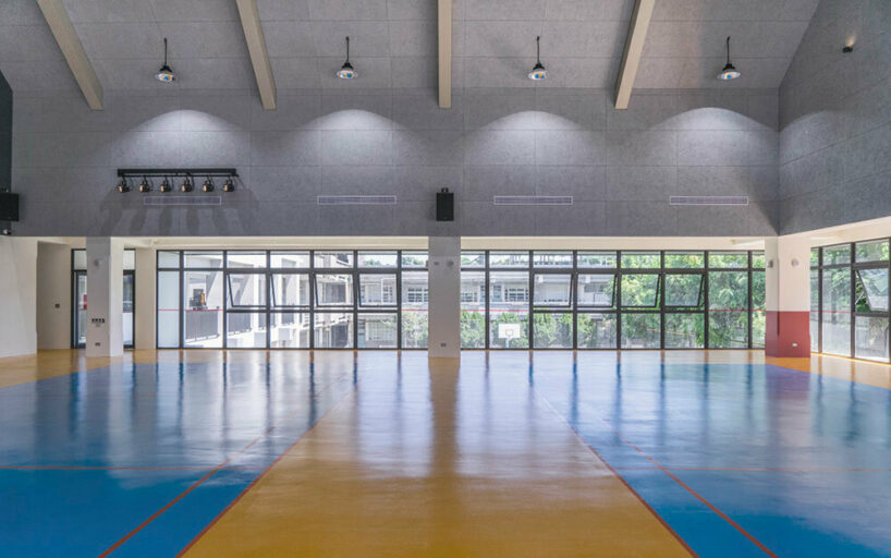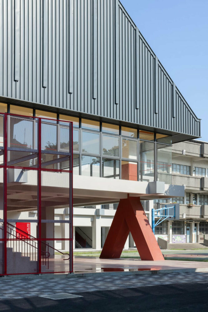 triangular metal roof crowns elevated sports hall in taiwan school extension