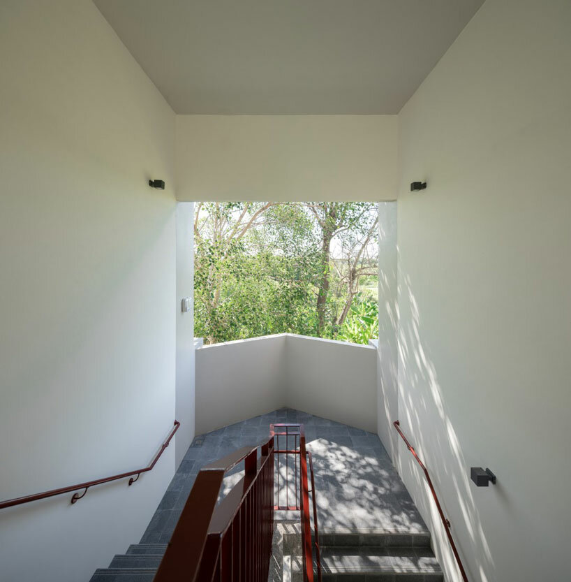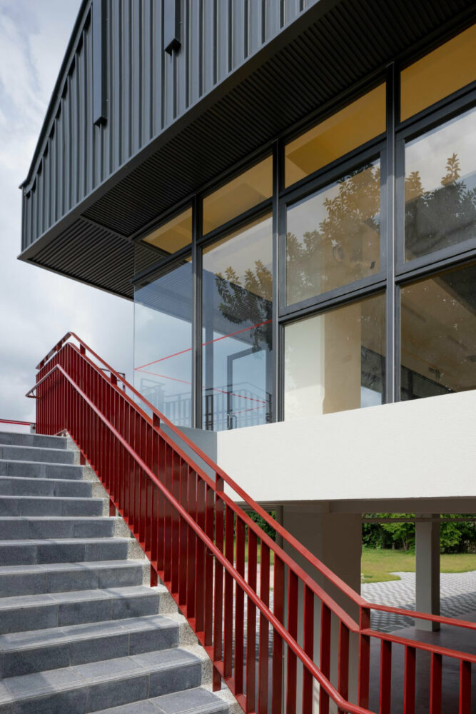 ‘The structural system and column spacing are optimized for the function of different spaces. The classrooms have small spans and are constructed with a simple concrete frame; the 2nd floor is a thick solid concrete slab with lattice beams to provide a bigger span lifting the stage and courts above; the big angled roof supported by slanted steel beams, the angle has been strategically designed to accommodate the flight path of badminton balls,’ explain the architects. The symbolic column, triangular roof, and red staircase become the key features of ‘Shui Yuan Assembly Hall’.