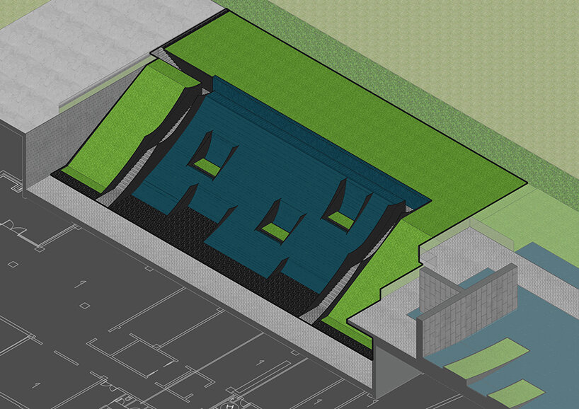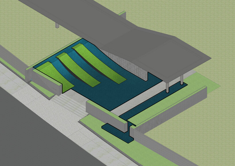 the project sits like a ring placed over the terrain, with its funnel-like roof forming a shaded perimeter walkway and an introverted core.