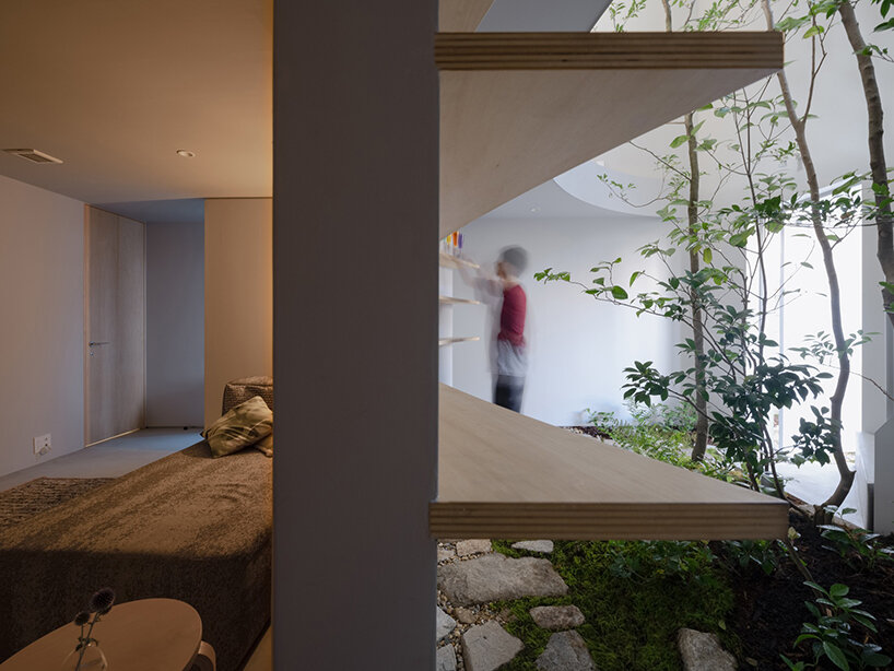 Bathed in ample daylight, the second floor serves as a lively public area, whereas the ground floor shelters private quarters like the bedroom and bathroom, which, although basking in subduded lighting, provide a serene sanctuary akin to a tranquil cave, ideal for unwinding and slumbering peacefully. To optimize the site’s limited space, an indoor garden, complete with a flourishing tree, graces the skylit atrium, replacing the conventional outdoor garden. ‘By incorporating it  indoors, the owner enjoys an immersive experience, directly engaging with nature rather than merely observing it through a window,’ notes Nagayama.
