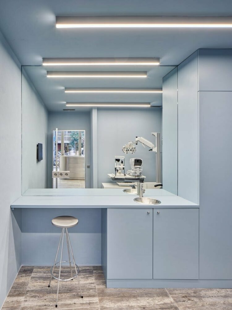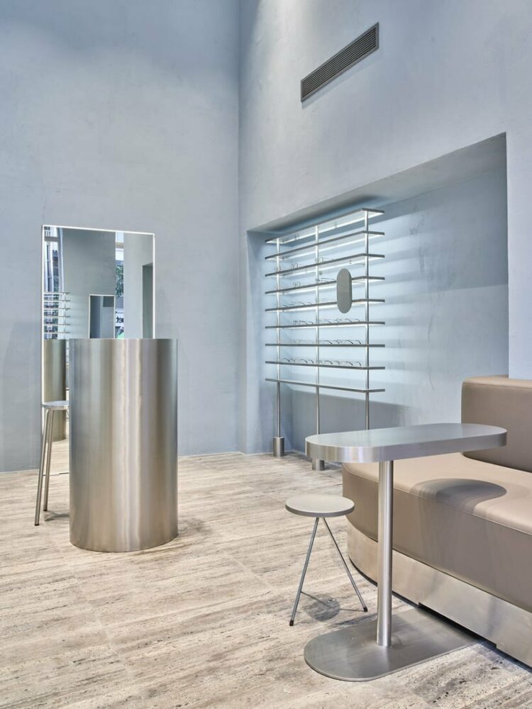 the silver travertine floor adds nobility to the space, engaging in a visual dialogue with steel surfaces