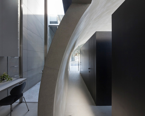 to provide a visual extension of the street, makiko tsukada architects has created the ‘tunnel house’, in tokyo japan. the exterior and interior are connected by a large carved-out section in the volume that is designed perpendicular to the road along which the building is situated. the tunnel-like configuration activates both ‘uchi’ (in the tunnel) and ‘soto’ (out of the tunnel) spaces as the home divided and linked by the gaping convex form. on the open side of the quarter cylinder, the façade is enclosed by glass. the ‘uchi’ comprises two rectangular areas that contain a bedroom and a bathroom. although hidden inside a concrete and steel structure, the bedroom embodies a lightness with an open ceiling and screen partitions. from the bedroom box above, the residents can view the top of the concrete shell.