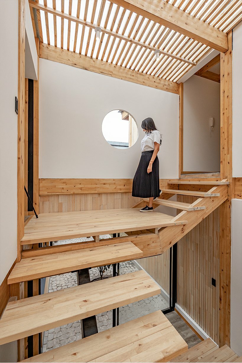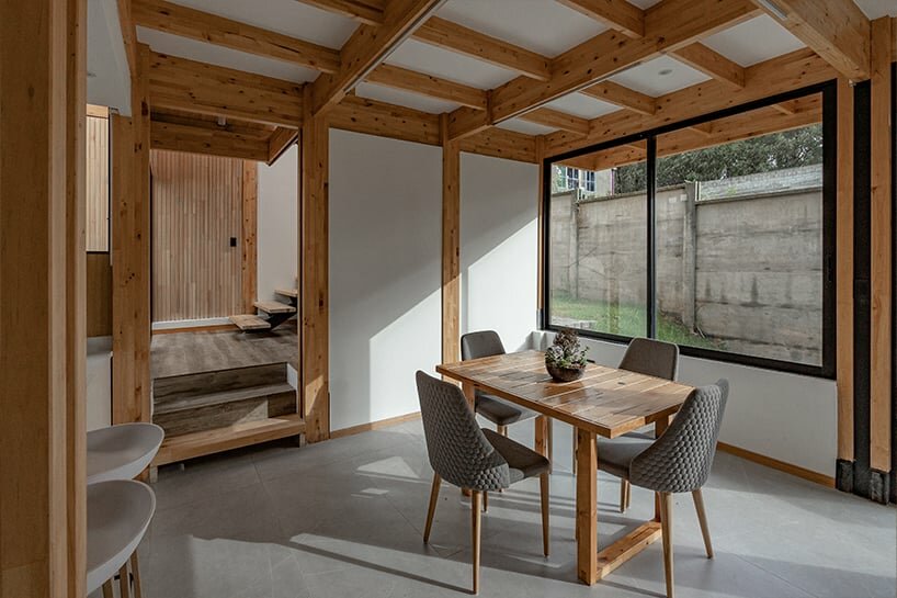 the design concept manifests in the form of two identical wooden blocks, separated by a connecting axis