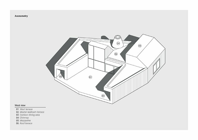 The building is equipped with a heat pump, and all ventilation ducts and smoke exhaust from the fireplace are located in one large chimney, which has the form of a truncated cone. A huge terrace is a place for living, resting and eating for the inhabitants of the house. Its slightly raised platform was intended to allow the household members to commune with nature, but without interfering with it. The result was not so much a house with a terrace, but a terrace with a house.