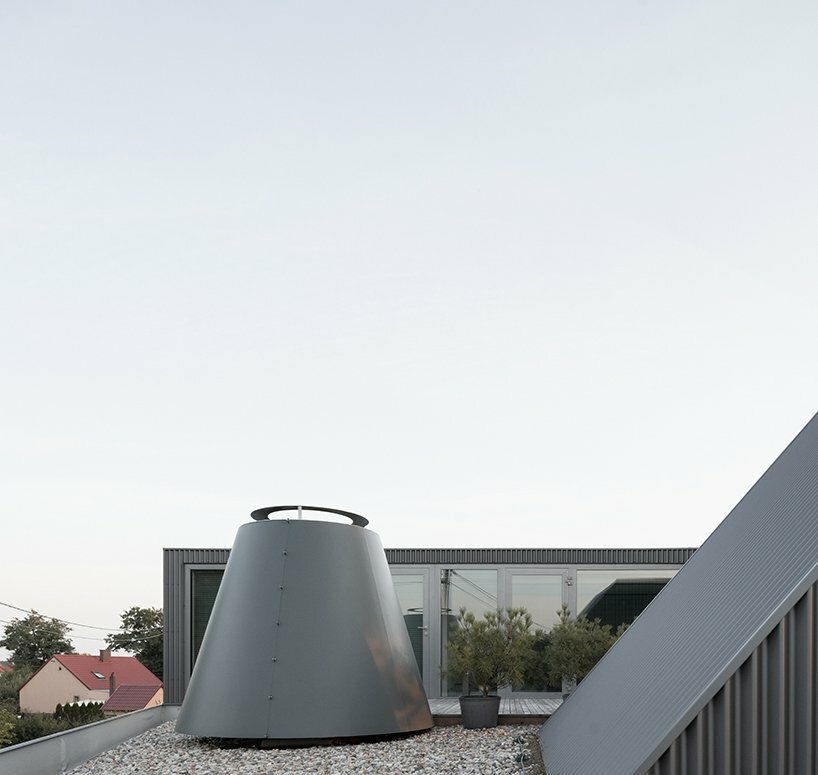 The technical nature of the material places it in the context of nearby farm buildings, some of which have corrugated asbestos roofs. The gutters are overscaled – they have rectangular gargoyles in the form of strongly protruding brackets, thanks to which the traditional vertical downspouts have been abandoned. The water that flows from the gargoyles does not run down the facade, but irrigates the plants around the house.