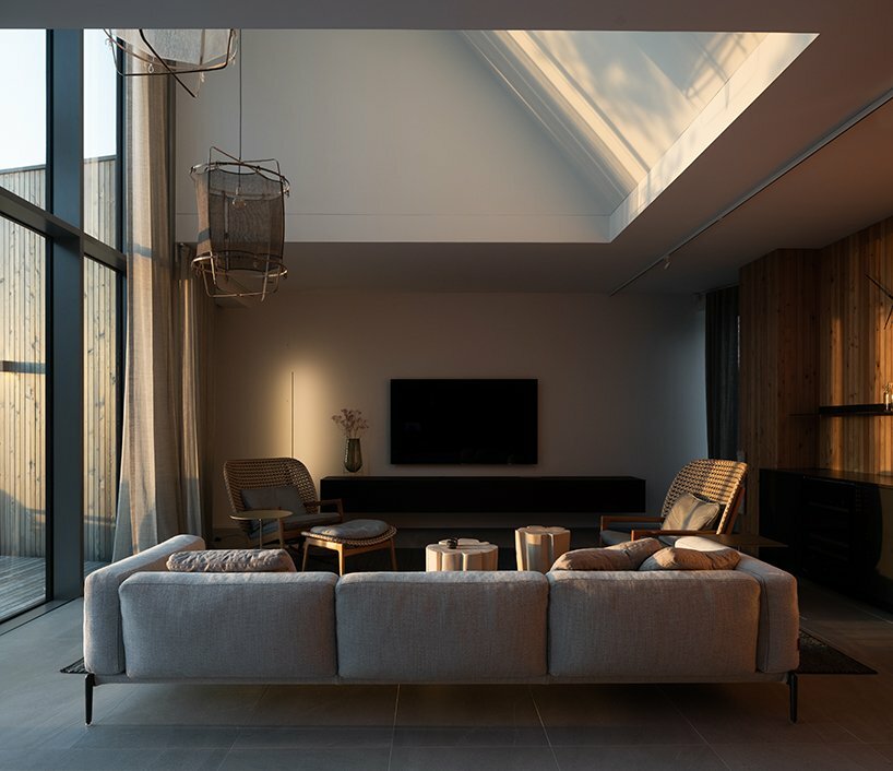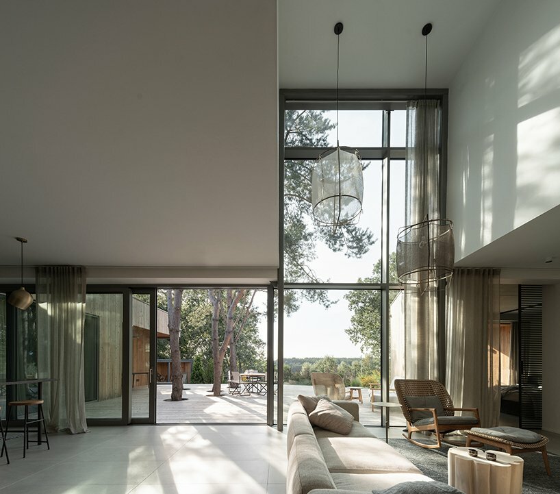 Atop a steep slope in the eastern part of Wielkopolska, Poland, UGO architecture has built a croissant-shaped summer house next to a tranquil lake. The residence encloses a 120-meter-long wooden terrace that extends into the living room and is shaded by mature pine trees of the area. The materiality of the building and the dynamic nature of its surroundings allow it to alter its appearance according to the time of day and the weather. In this way, the house becomes one with the forested Polish landscape.summer holiday on the terrace of the lake house from ugo architecture 1