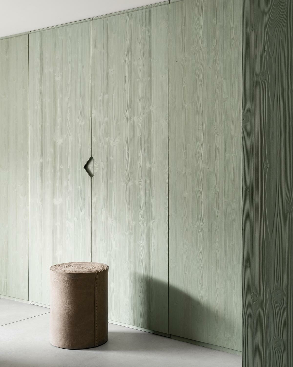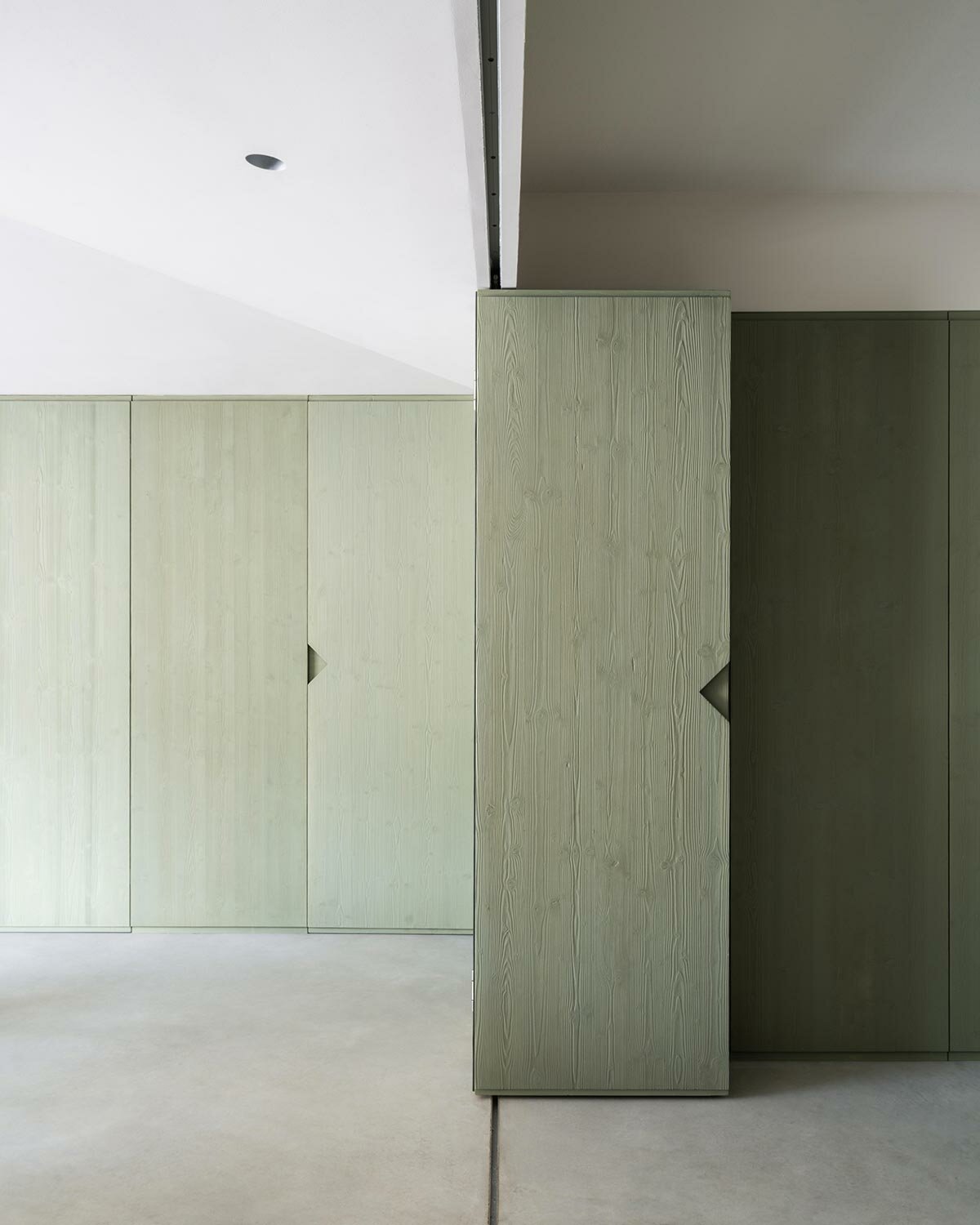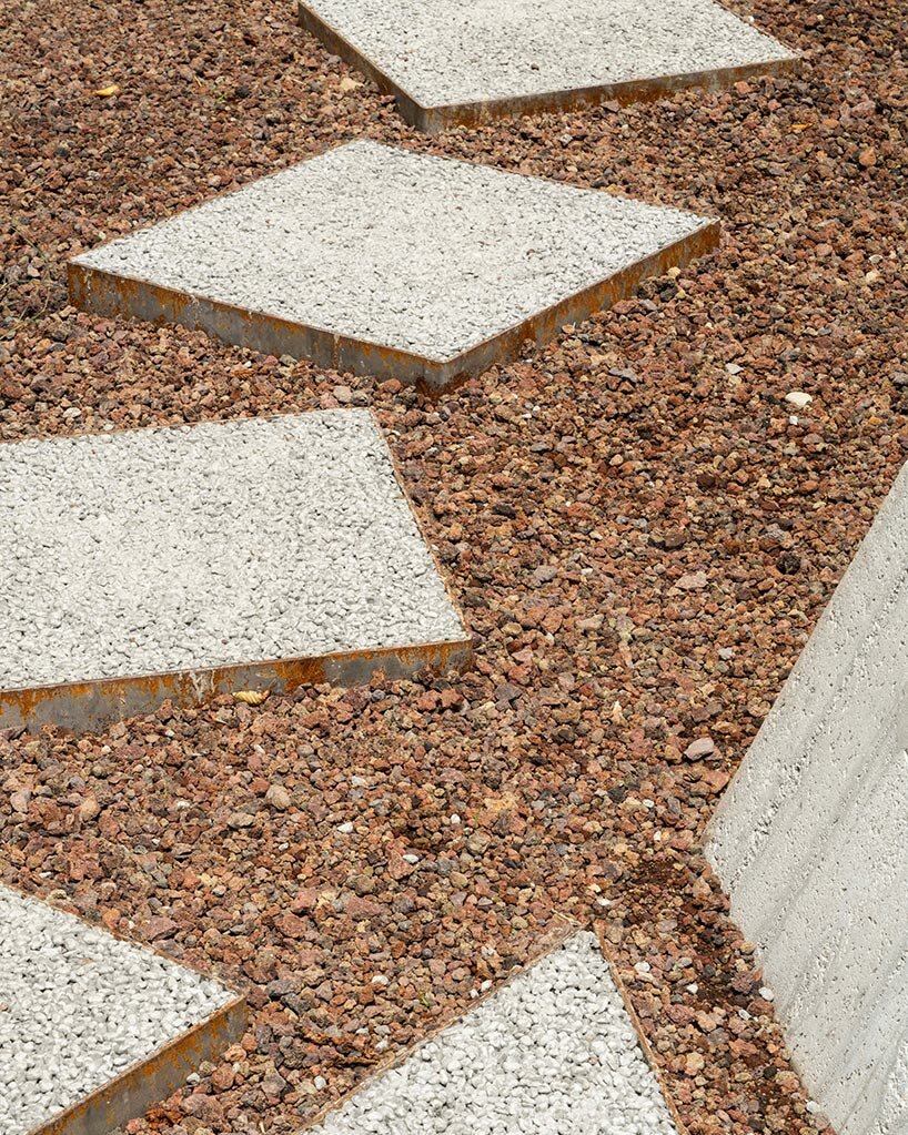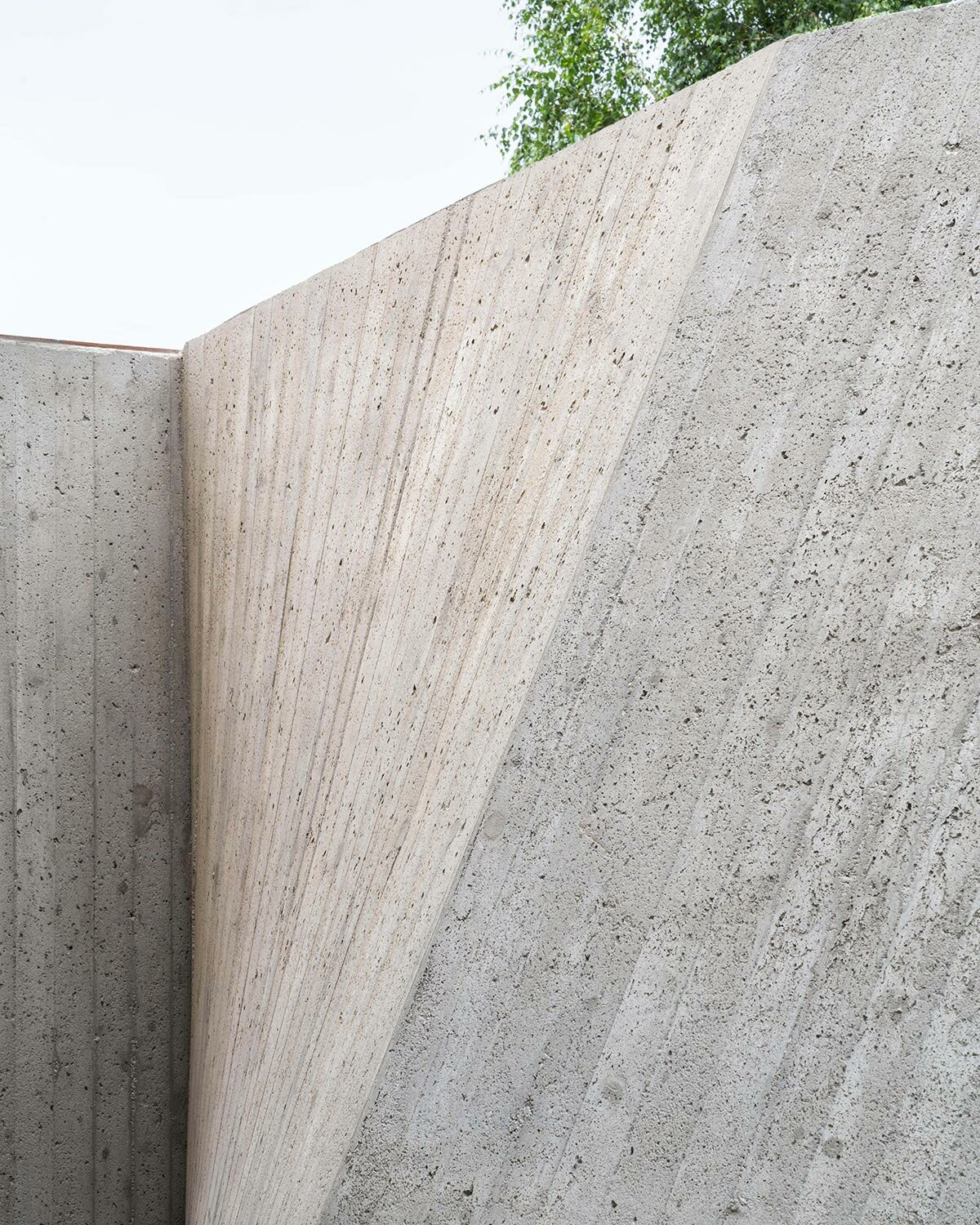 reinforced concrete exterior walls were form-worked with vertical wooden staves and sandblasted for texture