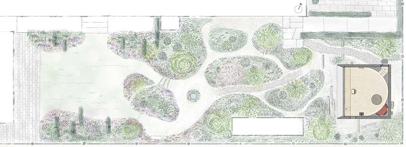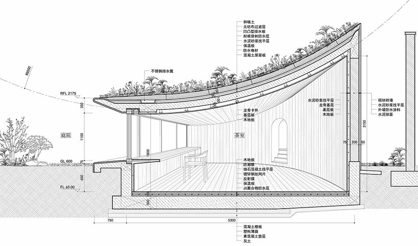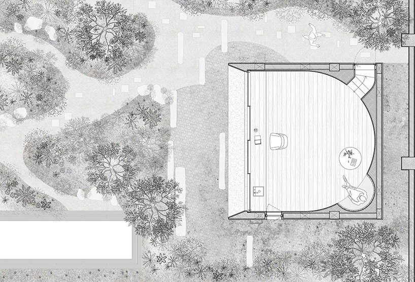 the project sits like a ring placed over the terrain, with its funnel-like roof forming a shaded perimeter walkway and an introverted core.