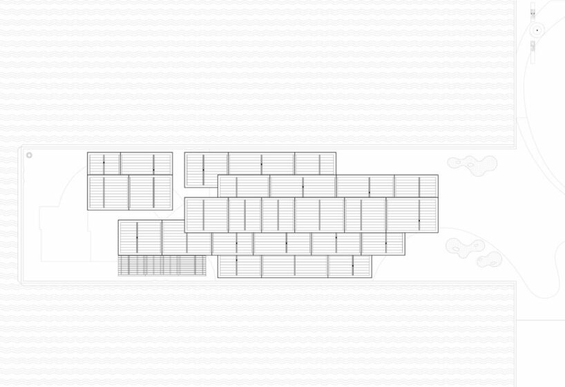 the project sits like a ring placed over the terrain, with its funnel-like roof forming a shaded perimeter walkway and an introverted core.