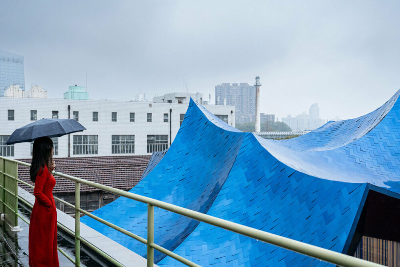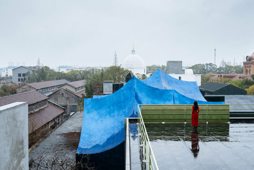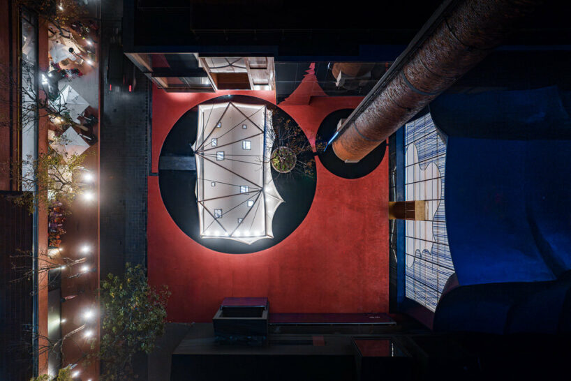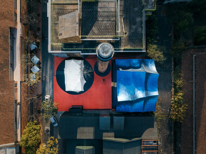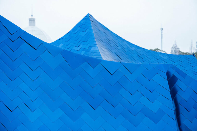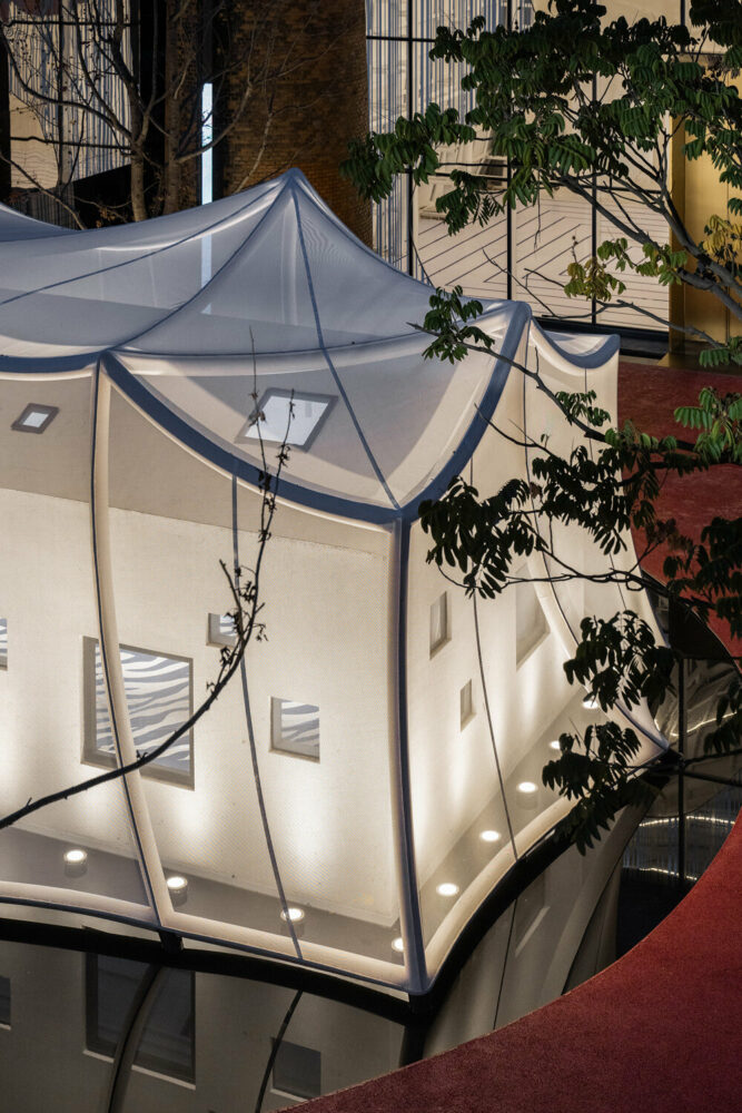 the project sits like a ring placed over the terrain, with its funnel-like roof forming a shaded perimeter walkway and an introverted core.
