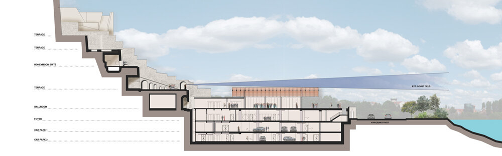 a continuation of the existing rock formations, the hotel is articulated as a series of stepped horizontal planes, courtyards, and gardens.