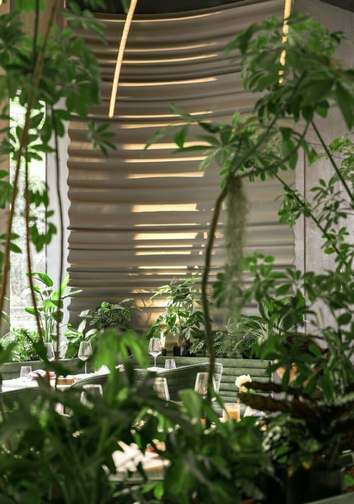 to further enhance the spatial experience, a large lighting installation inspired by the sparkling embers of a firewood flame hovers above the main dining area. meanwhile, green pops of color peek out from the otherwise muted furniture, adding ‘an outdoor oasis feeling’, as the architects mentioned. the southwest orientation of the site provided a prime opportunity to incorporate abundant greenery in both the indoor and outdoor dining environment, creating a natural and soothing atmosphere. the wine racks are placed alongside the existing columns, increasing the privacy of the costumers yet adding a luminous element between the tables. ‘from the sparkling interior design to the aromatic food, there is satisfaction for both visual and literal appetites.’sculptural walls emerge within WAY studio's restaurant in shanghai