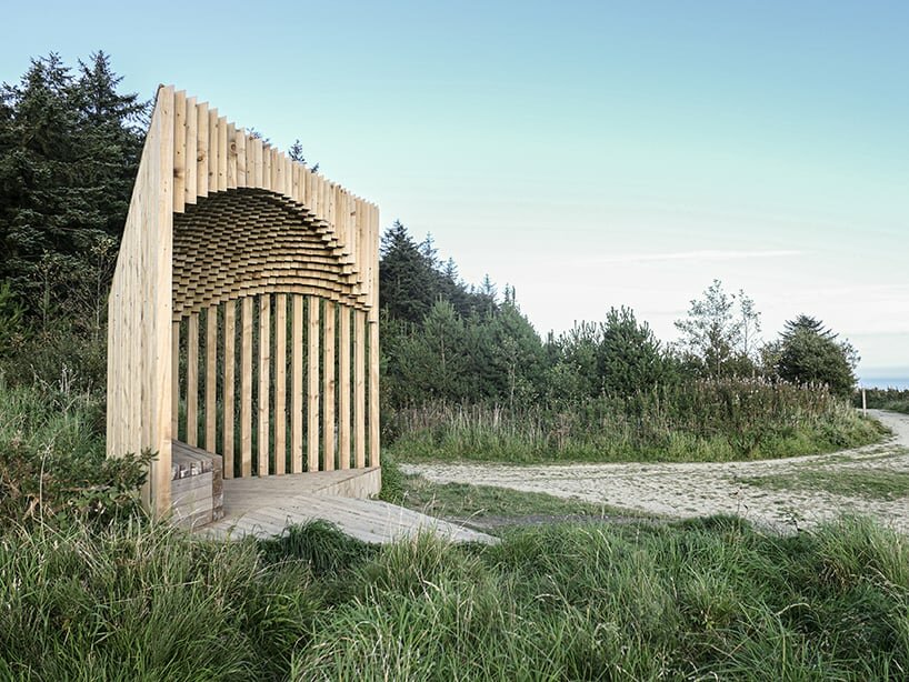 The UNESCO Biosphere Shelter Conrhenny celebrates the union of nature, culture, and people on the Isle of Man. Realized by Slovak architects Betty Laurincova and Michal Kotvan, the shelter utilizes locally sourced timber to harmonize with its surroundings and offers scenic views of Douglas Bay, serving as a focal point for connecting with the island’s biodiversity. Positioned at the junction of two pedestrian paths, one of its walls is semi-open, offering an enhanced overview and a sense of safety. The roof, a script-generated dome, disrupts the symmetry of the basic geometry by subtracting an ellipsoid from a simple form made of 100x100mm timber profiles. An integrated ramp completes the square footprint.