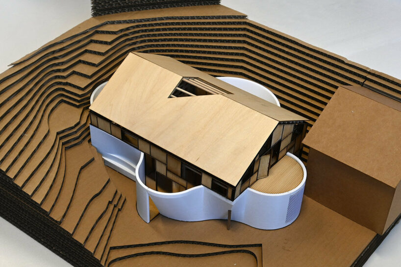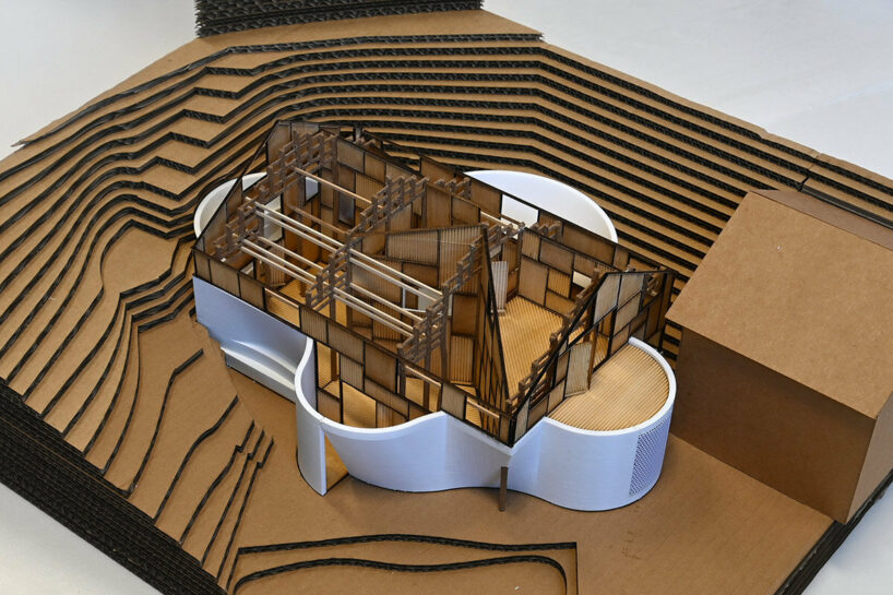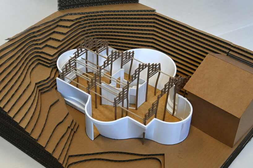 the project sits like a ring placed over the terrain, with its funnel-like roof forming a shaded perimeter walkway and an introverted core.