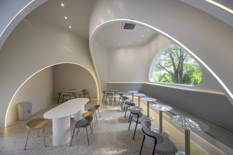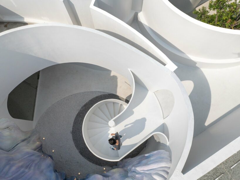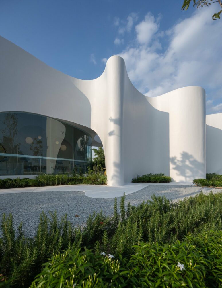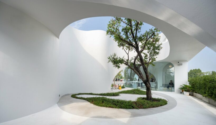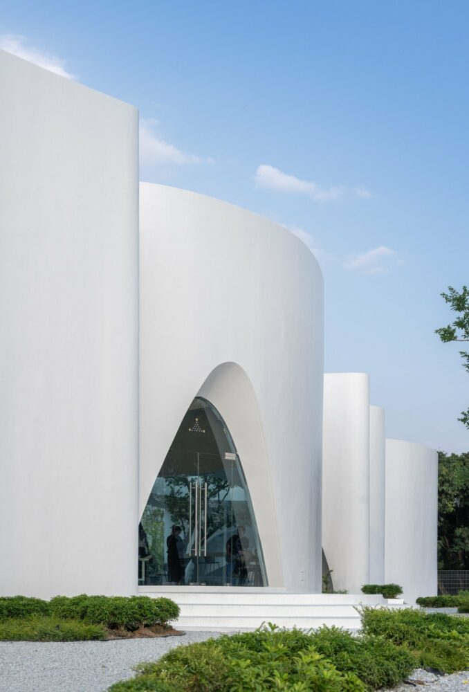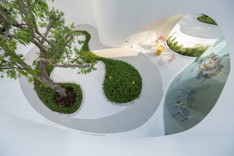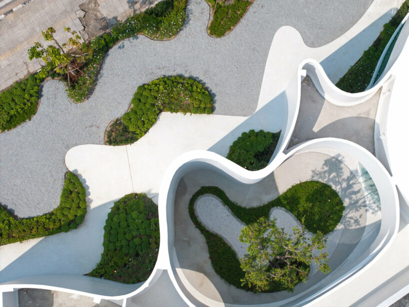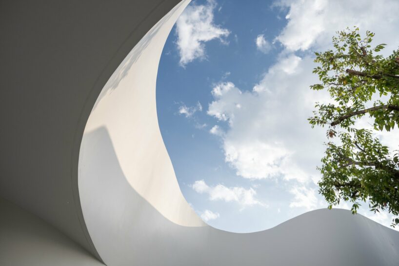 the project sits like a ring placed over the terrain, with its funnel-like roof forming a shaded perimeter walkway and an introverted core.
