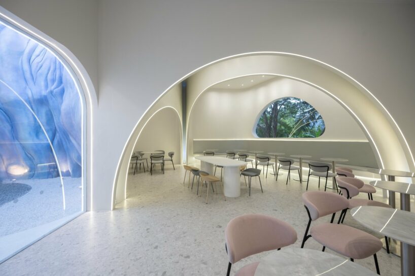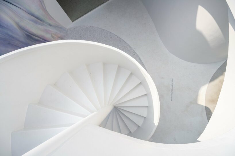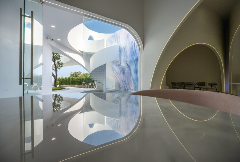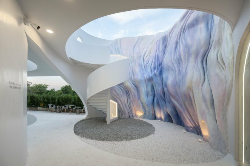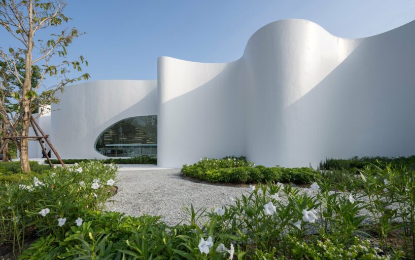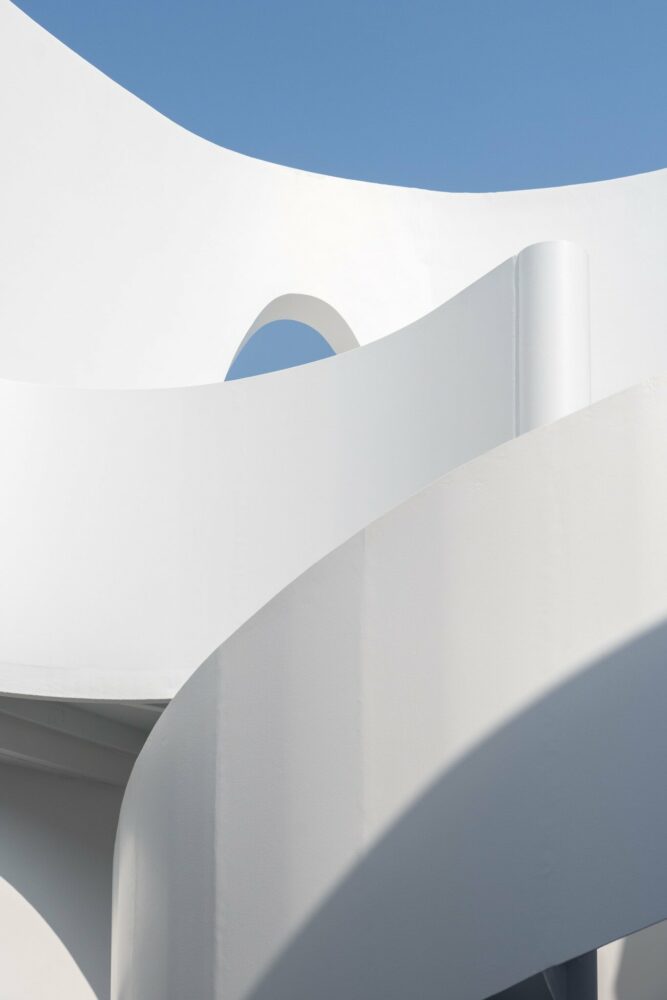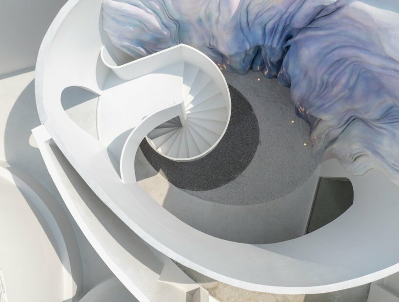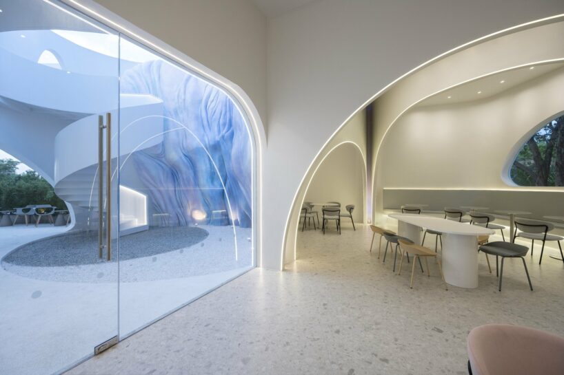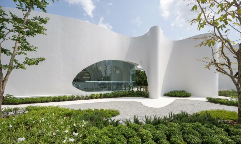 the project sits like a ring placed over the terrain, with its funnel-like roof forming a shaded perimeter walkway and an introverted core.