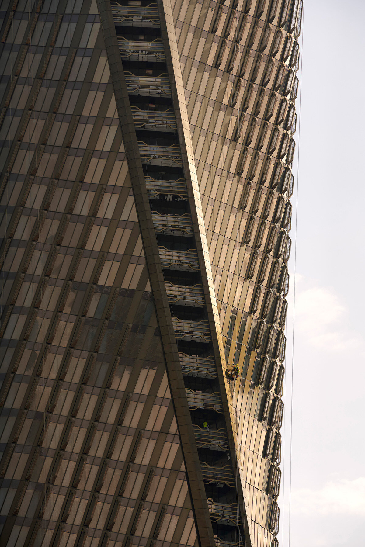 the building’s sculptural form is based on contrapposto and rotates along its vertical axis