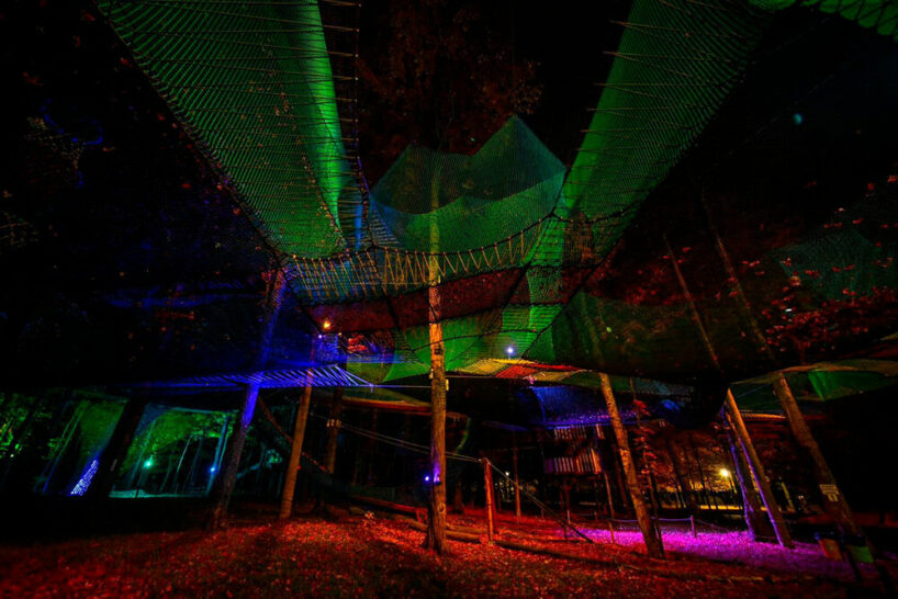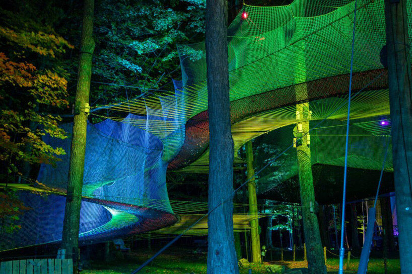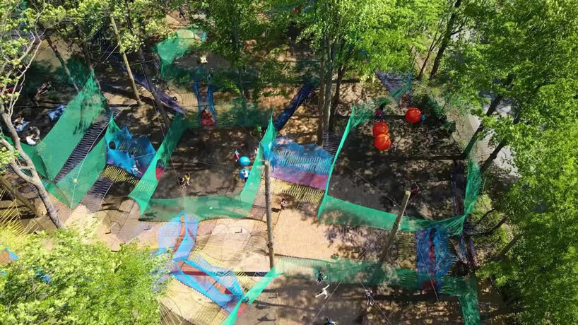 nine vibrant webbed surfaces, slides, and tunnels invite young and old to connect with nature