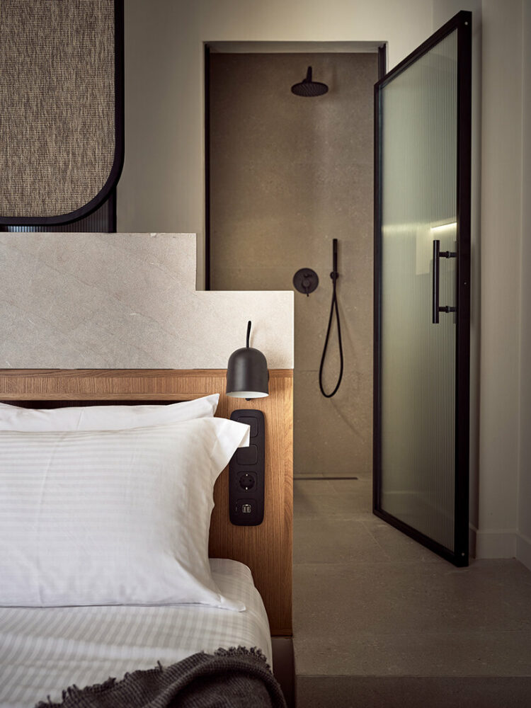 oak wood finishes, light fabrics, and veiny marbles create a serene retreat