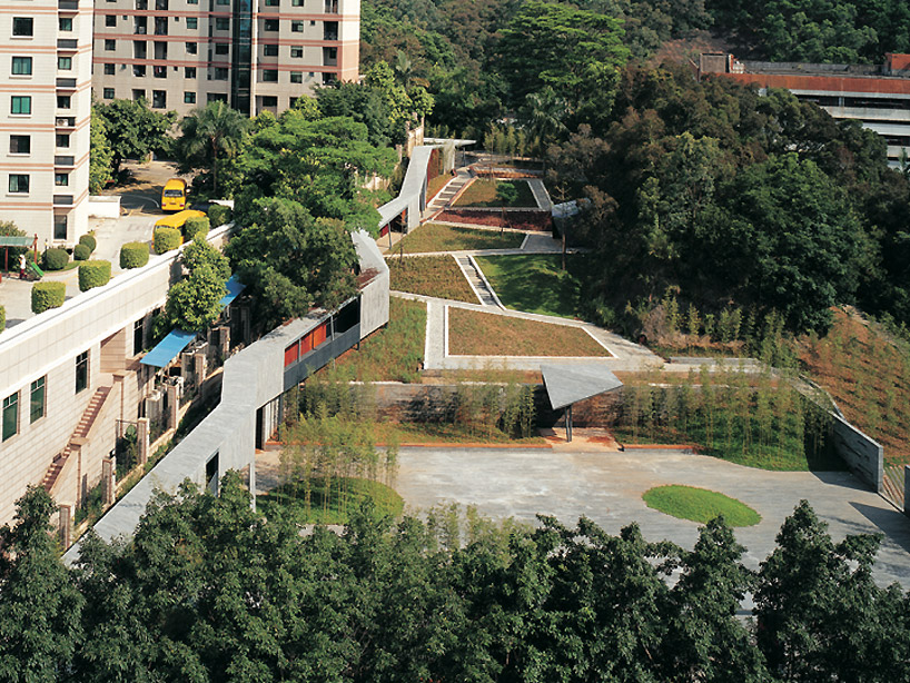 the project sits like a ring placed over the terrain, with its funnel-like roof forming a shaded perimeter walkway and an introverted core.