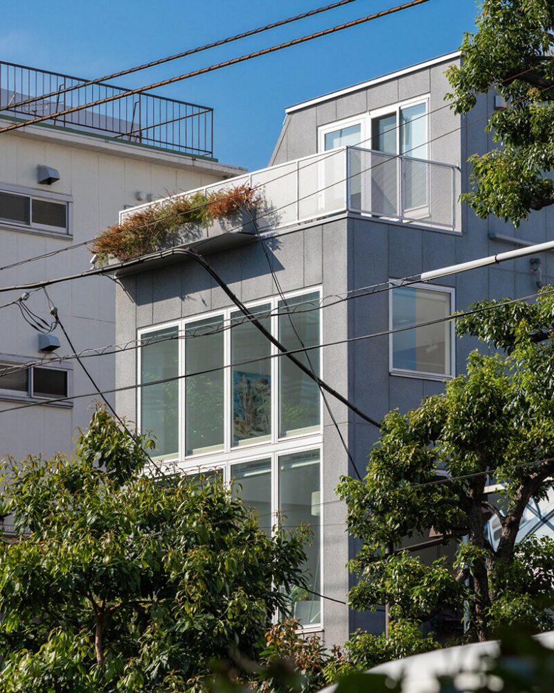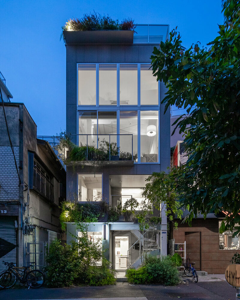 van der architects (see more here) incorporates greenery on almost every level of the five-story house on kananadori. while the entrance to the house is nestled beyond a lush wall of plant-life, the first and second levels and the rooftop are extended with plant-filled ledges to enhance the atmosphere inside with a view filtered by leaves.