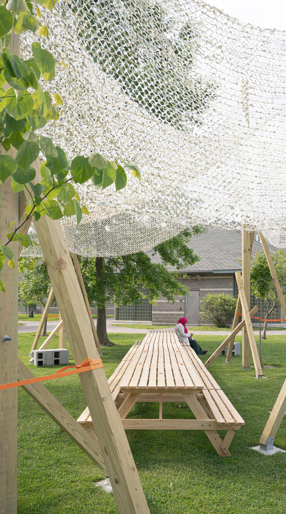 columns resembling tree stakes support a lightweight textile canopy, optimizing shading based on the sun’s path
