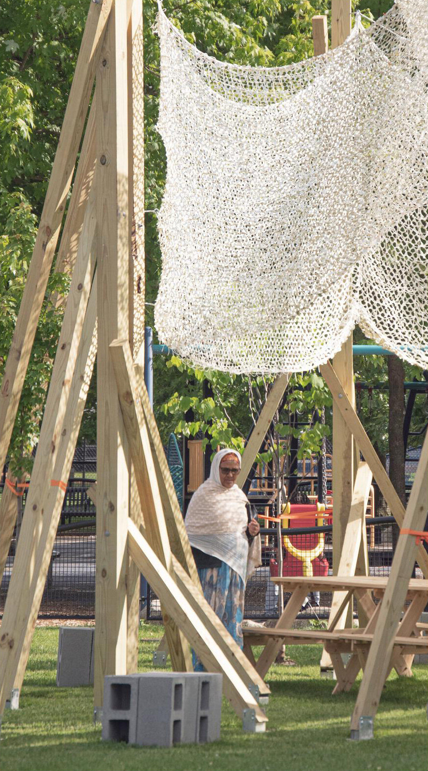 the installation functions as an outdoor community room with flexible summer use