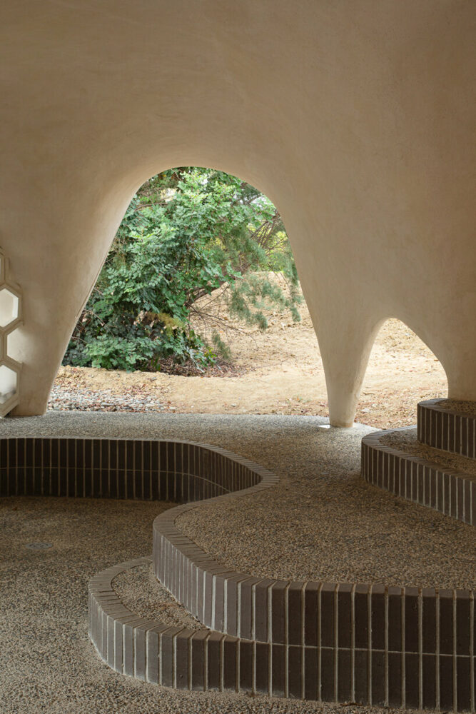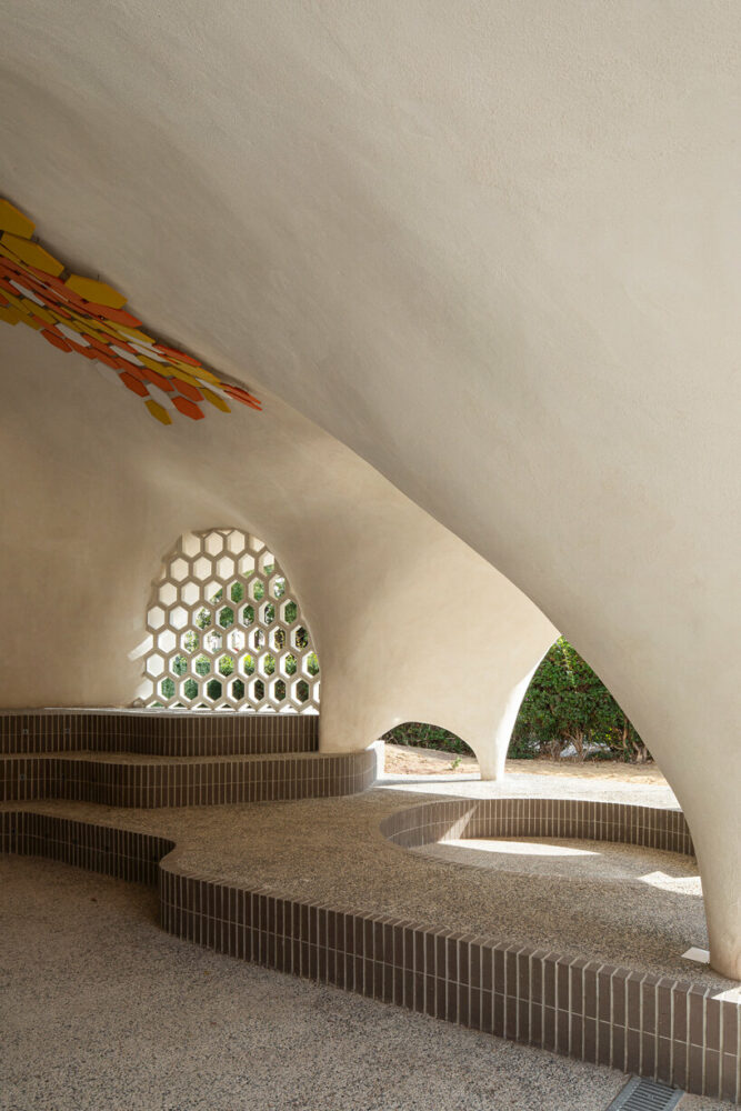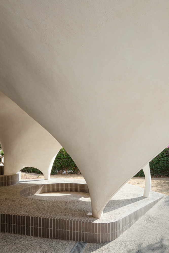 the project sits like a ring placed over the terrain, with its funnel-like roof forming a shaded perimeter walkway and an introverted core.