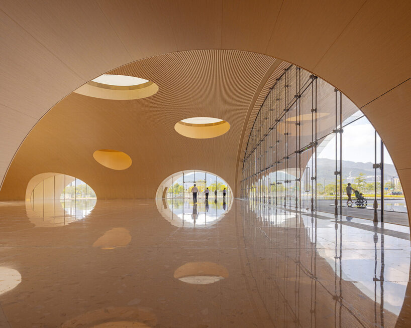 the project sits like a ring placed over the terrain, with its funnel-like roof forming a shaded perimeter walkway and an introverted core.