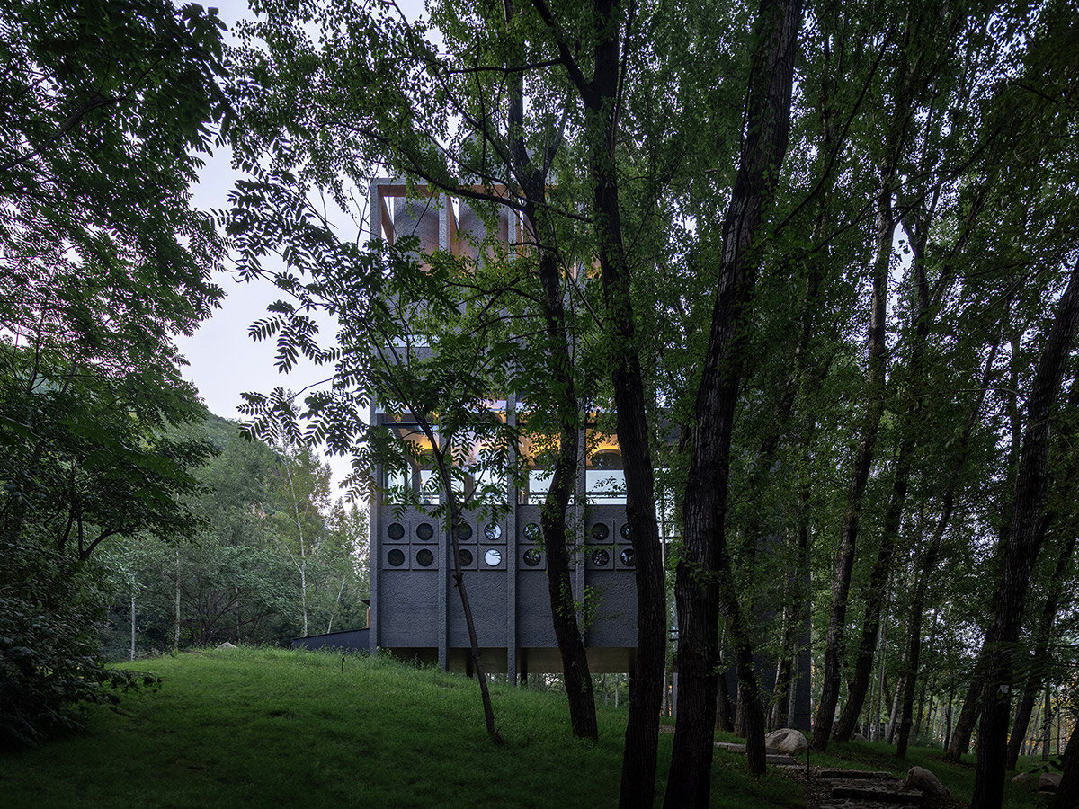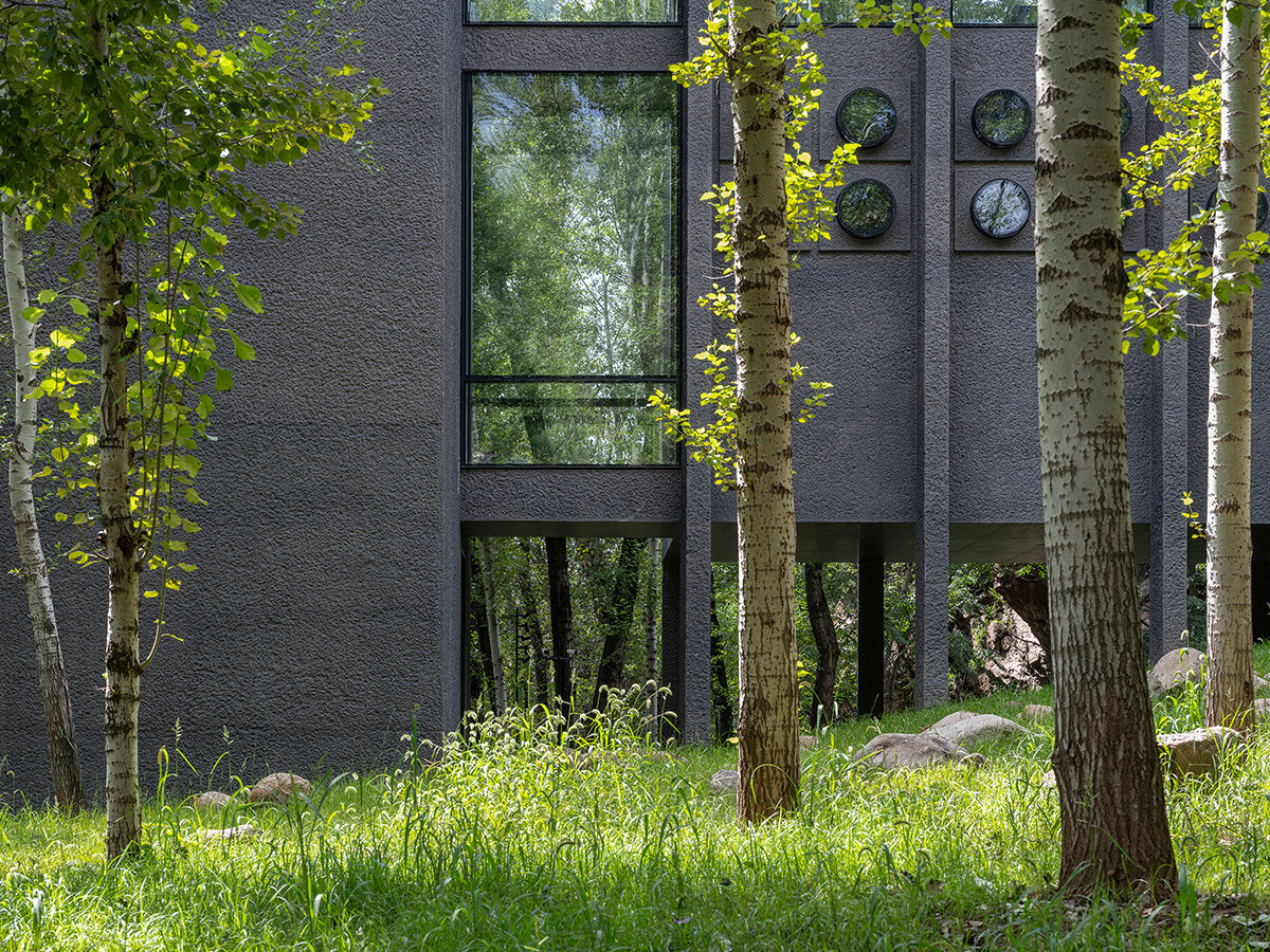 the second floor is a glass lounge surrounded by tree canopies with operable windows